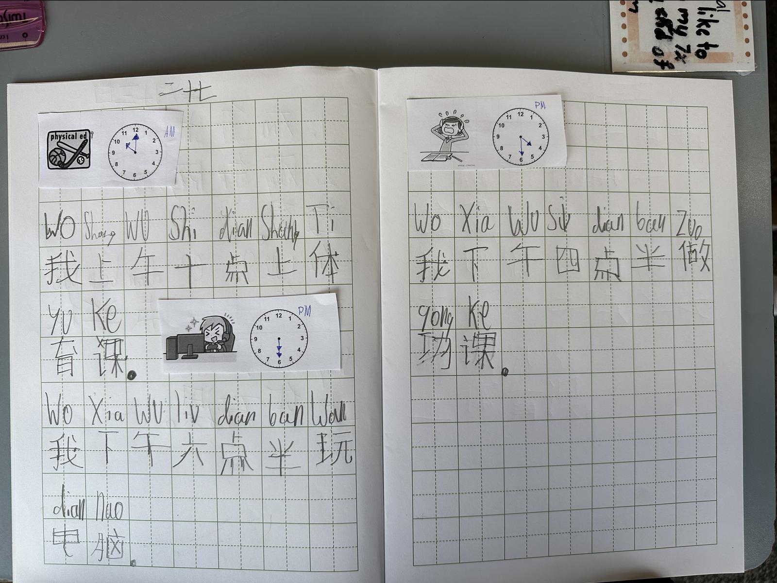 This week in Mandarin, our Grade 5/6 students have been expanding their language skills by learning how to talk about school subjects, activities, and telling time in Chinese. They have also been practicing writing sentences about their schedules, confidently expressing when they have certain classes or activities.