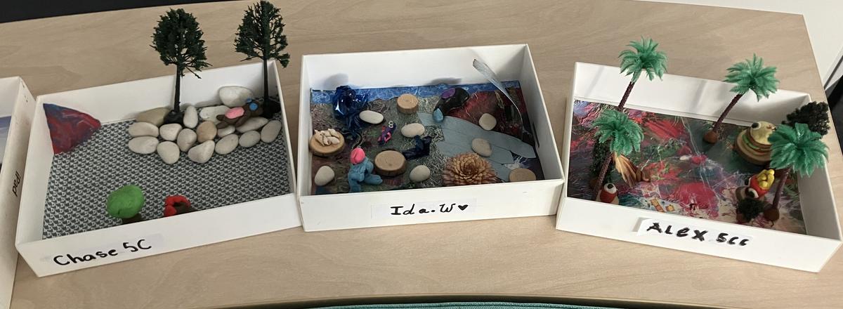 Here are some fabulous 3D creations by Level 5 students, who made their own 'World' using arial photographs as backgrounds and lots of different natural, recycled and landscaping materials. Inhabitants of their worlds were made with plasticine and other materials, creating an inviting and interesting scene. Students were inspired by a painting ‘A room made of Water’ by artist Leah Bullen 2024, and the book ‘Planet Earth’ by the German Aerospace Centre.