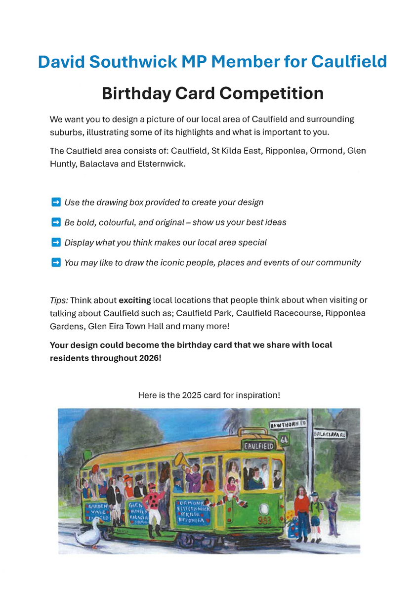 Please find the Birthday Card Competition Template attached or copies will be available at the office.