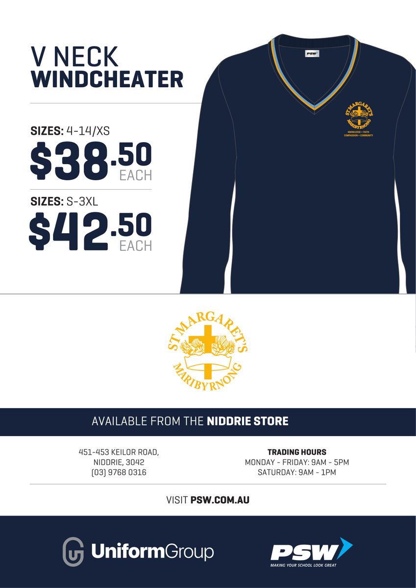 The school uniform shop supplier (PSW) has relocated to 451-453 Keilor Road Niddrie. Appointments for uniform fittings can be made by calling 9768 0300. Alternatively, orders can be placed online with either a home delivery or click and collect service available.