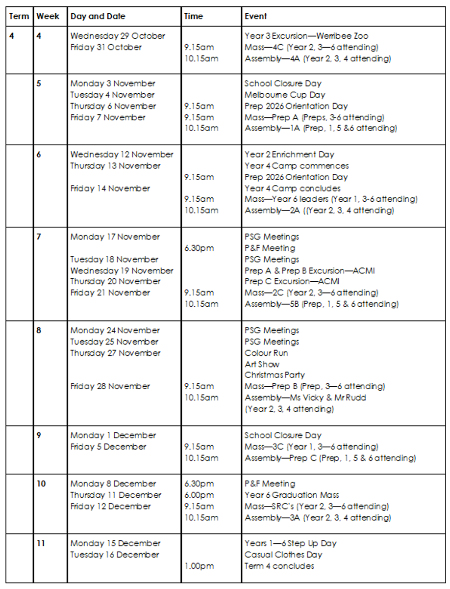 Term 4 | Monday 5 October | Tuesday 15 December |