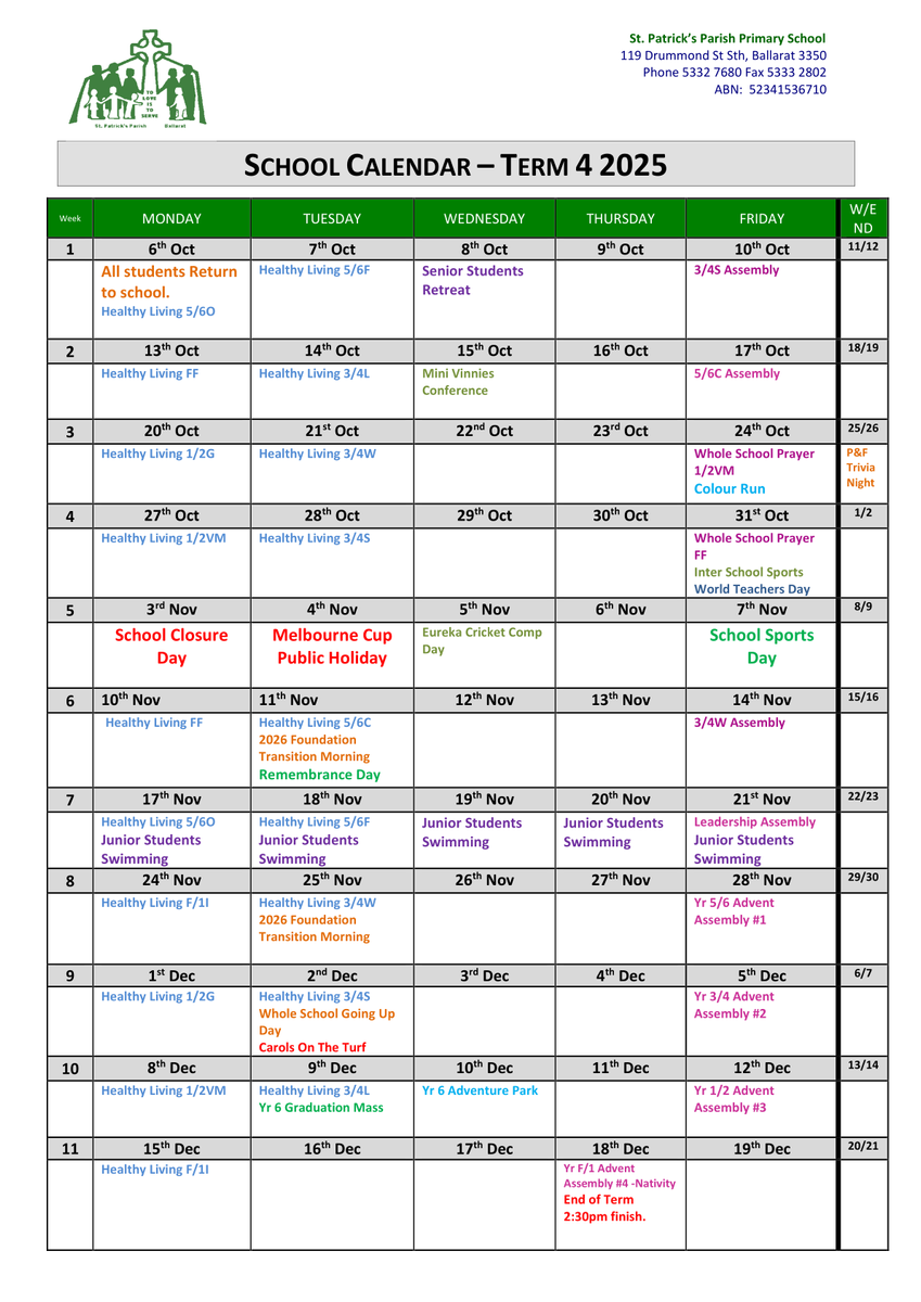 Footy Colours Day - Last Day of term 3, Loreto College Enrolments 2027, St Patrick's College Enrolments 2027, Trivia Night, Extend Community Link, CDF, 2025 Timetable