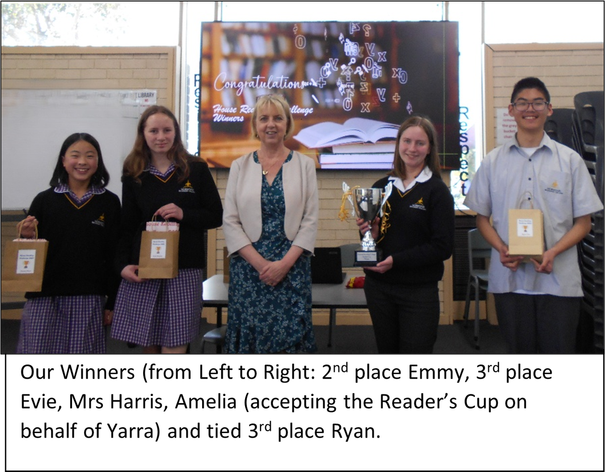 On Wednesday students from this year’s winning house as well the individual winners joined together at lunch time for a celebratory Pizza Lunch and Book Trivia challenge. The Year 7 - 9 English Teachers as well as our Principals, Mrs Harris, Mrs Watson, and Mr Mamoliti joined the students for lunch to celebrate Yarra House, who with 194 points was the winning team for the third straight year in a row.