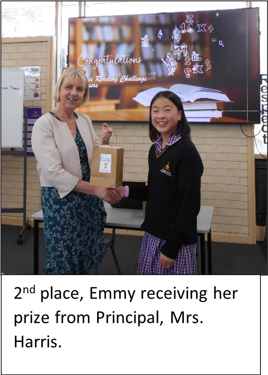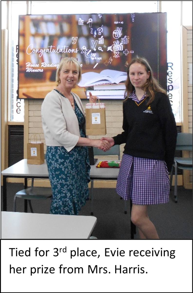 After lunch, Mrs Harris presented the prizes to our winners (pictured below). Unfortunately, Ella our first-place individual winner, who read 59 books over the 3 months was unable to join us on the day. Emmy, who read 23 books, came in 2nd and Evie and Ryan tied for 3rd place, reading 22 books each.