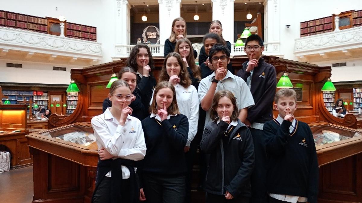 By way of a thank you, Ms Mill the Librarian and Ms. Bishop travelled with these students to the State Library for a tour from one of the educators. Sarah Amos, a former Norwood teacher, who now works at the State Library, took our students through various parts of the Library, showing them the breadth and diversity of resources in the collection. They were able to view amazing artworks and view ‘The World of the Book’ exhibition firsthand. It included incredibly old manuscripts on vellum as well as more modern books such as Terry Griffin’s Treehouse books. They also ventured into the newspaper stacks and the Reading Room with a rare chance to have their picture taken on the Hushing Chair. Yes, it’s true, someone was employed up until they 1980’s to keep people quiet while they were using the library. The students had a fantastic day learning about not just the history of this beautiful library, but also about the free membership offered to all Victorian residents, which gives them access to a wealth of knowledge and information both physically and digitally.