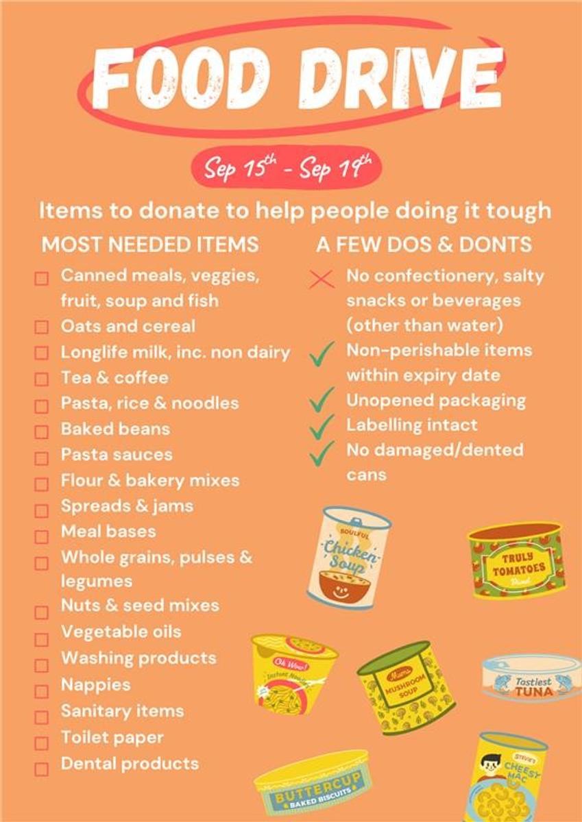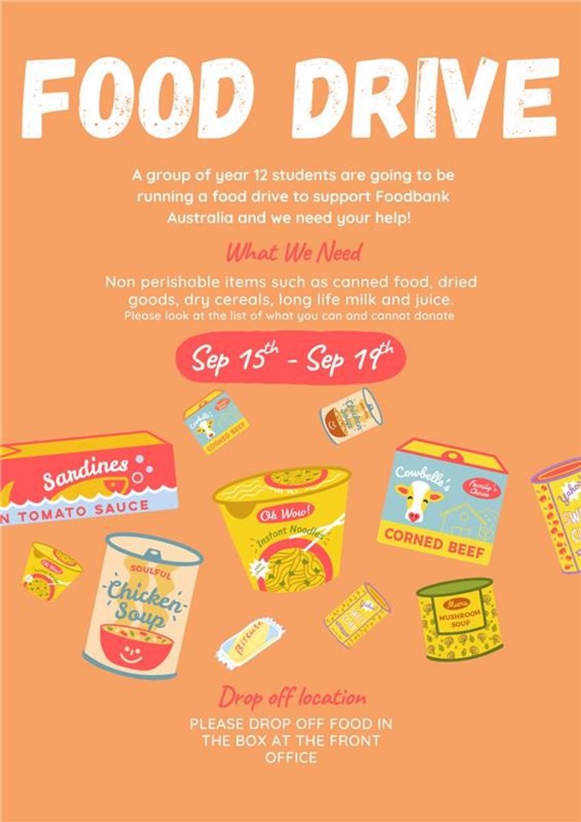 A group of year 12 students are going to be holding a food drive to support Foodbank Australia in collecting non-perishable food items to help families and individuals in our community who are facing food insecurity, and we need your help to make it a success!