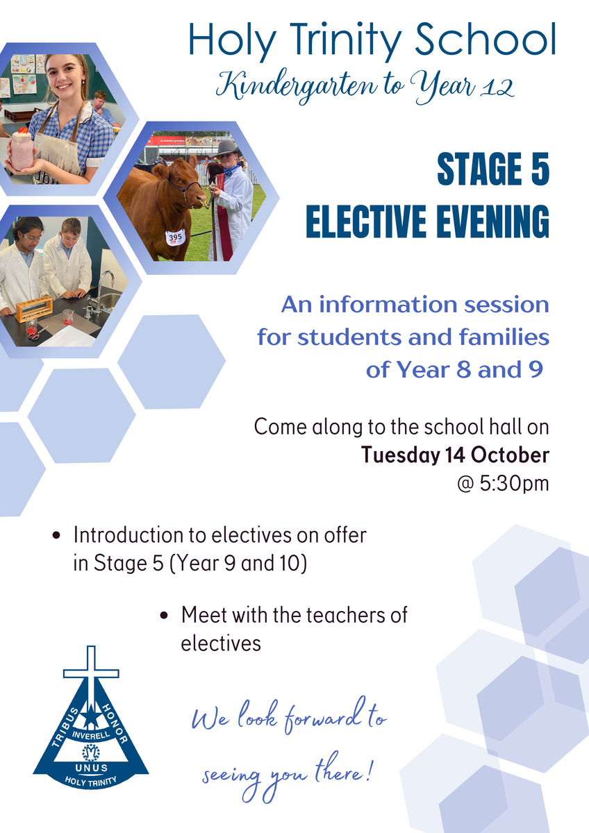 Year 8 and Year 9 students have received an information handbook, which is a guide to the elective courses of study available to Year 9 and Year 10 in 2026. A PDF copy has also been emailed to all students. An Elective Information Evening will be held on Tuesday 14 October (Week 1, Term 4) in the Hall from 5.30 pm to 6.30 pm. Parents and students will have the opportunity to meet with staff to discuss the various elective study options for students in 2026.