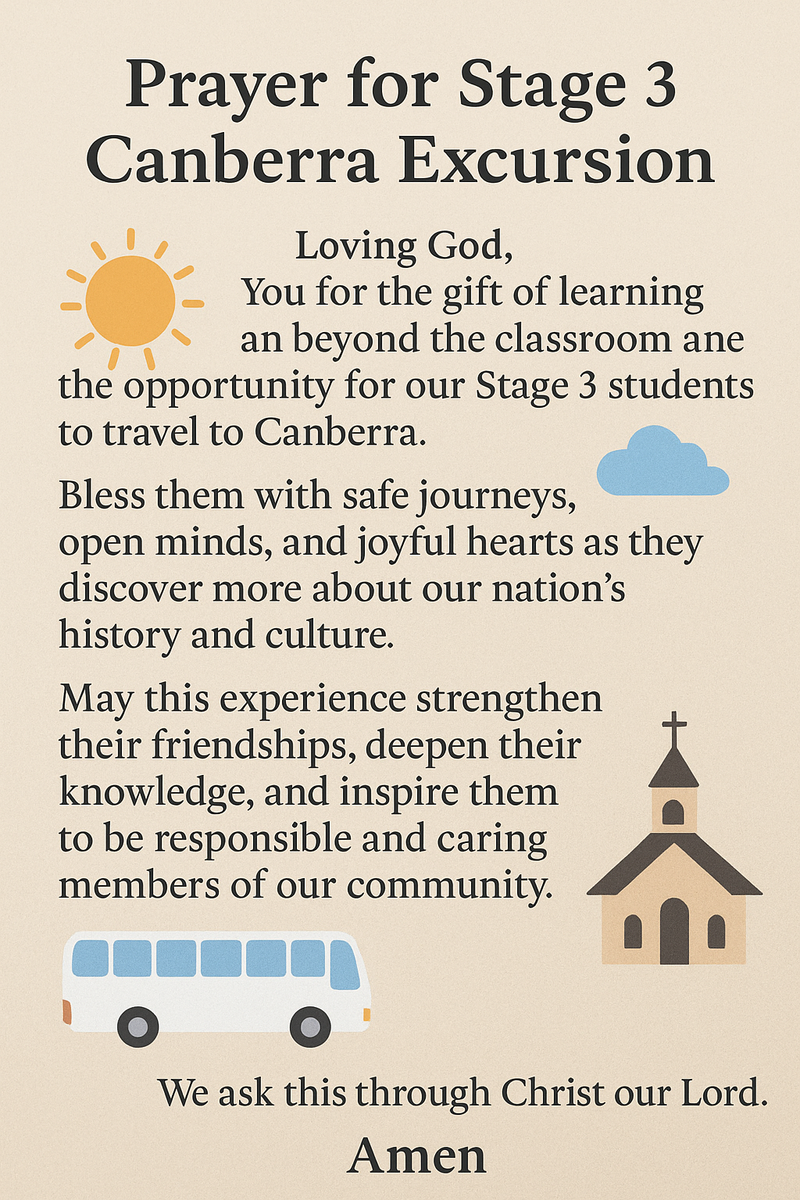 As our Stage 3 students and staff prepare for their Canberra excursion, I would like to wish them a safe and enjoyable trip. This experience is a wonderful opportunity to learn more about our nation’s history and government, as well as to build memories together as a group. I remind all students of the importance of representing our school with pride by showing respect, responsibility, and kindness at all times. A reminder also that devices are not to be taken on the excursion, as we want students to be fully engaged and present throughout the week. We look forward to hearing all about their adventures when they return.