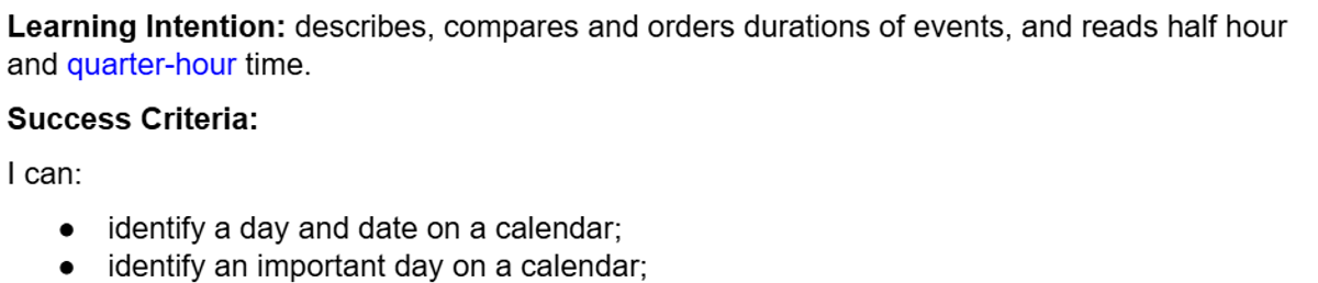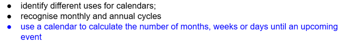 Discussing important family dates by using a standard calendar to illustrate when these events will occur. Calculate how long until these events happen, for example, It’s 5 days until your sister’s birthday, It’s 2 weeks and 3 days until school holidays or It’s 4 months and 2 days to Christmas