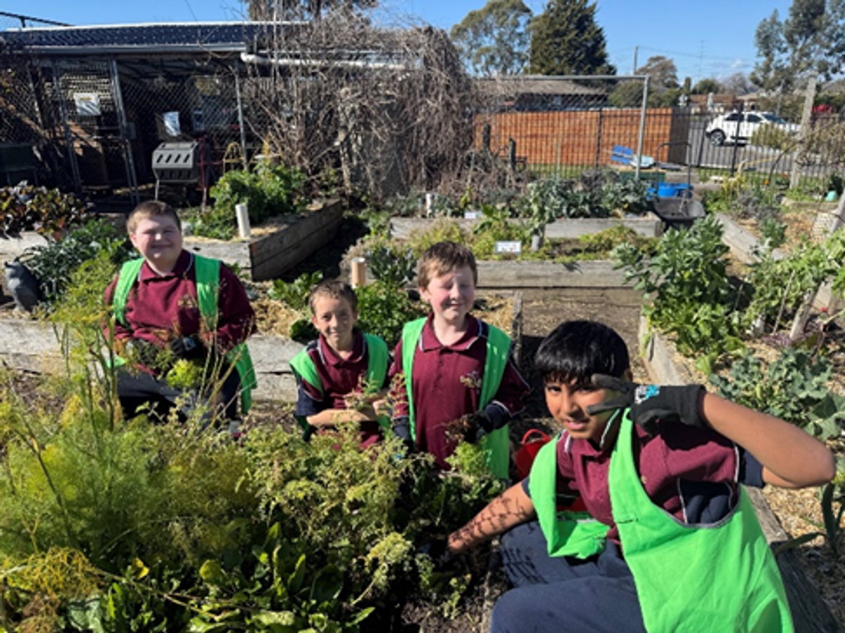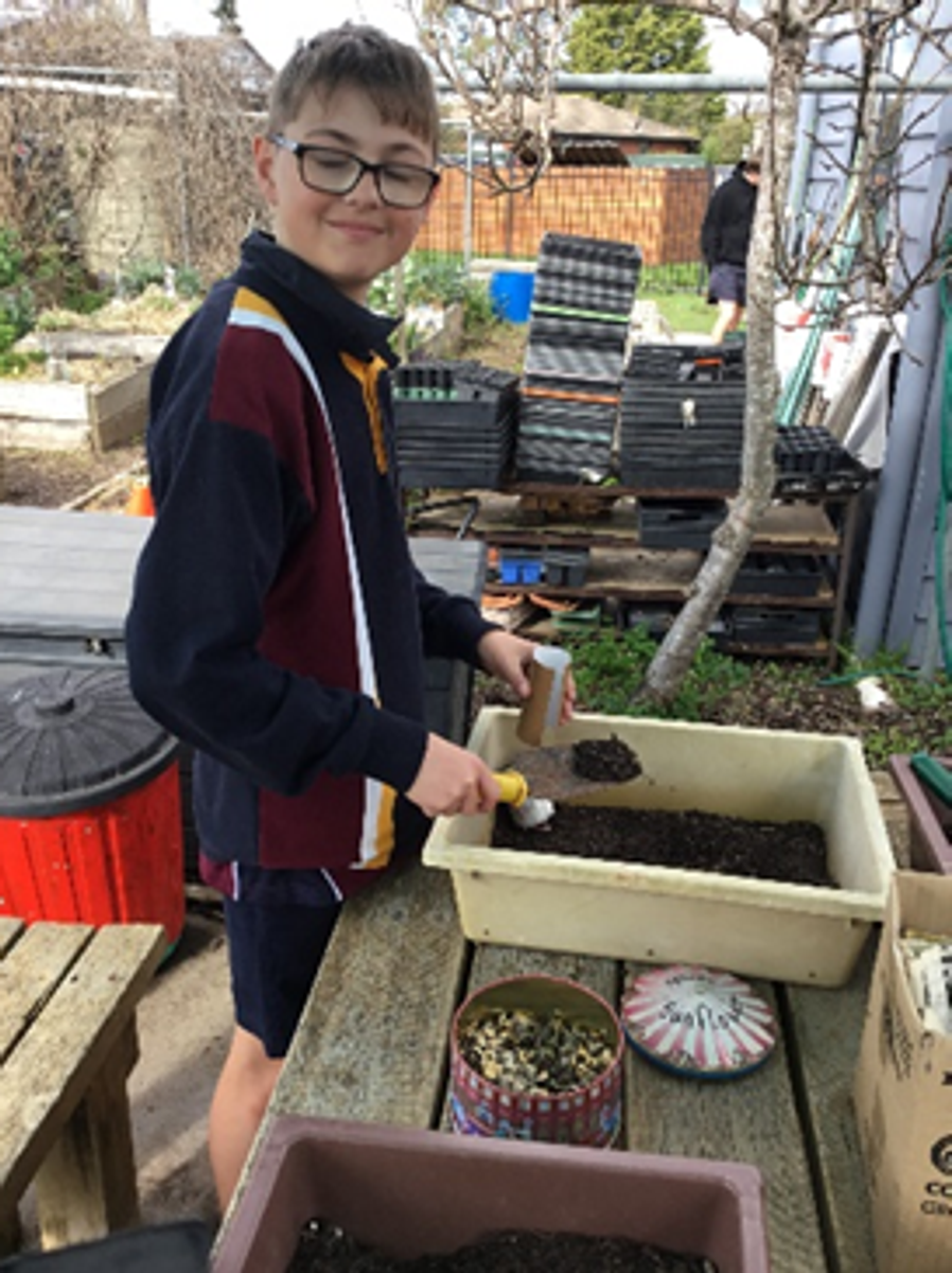 Year 4s and 5’s are thinking about the growing season in the school garden. Questions are posed for students to consider such as: When is the growing season in Ballarat? Why do we call it the growing season? Building their knowledge about the cold temperate climate in Ballarat that has a short growing season. Learning that there is a right time to sow seeds, that depends on the amount of warmth in soil and available light. Students also get to look at a variety of seeds and view sunflower seeds germinating in a viewing jar. Jodie then demonstrates how to sow seeds into a punnet that is then put in the greenhouse. This warm environment means that seeds can be germinated earlier. A couple of tips she shared are: