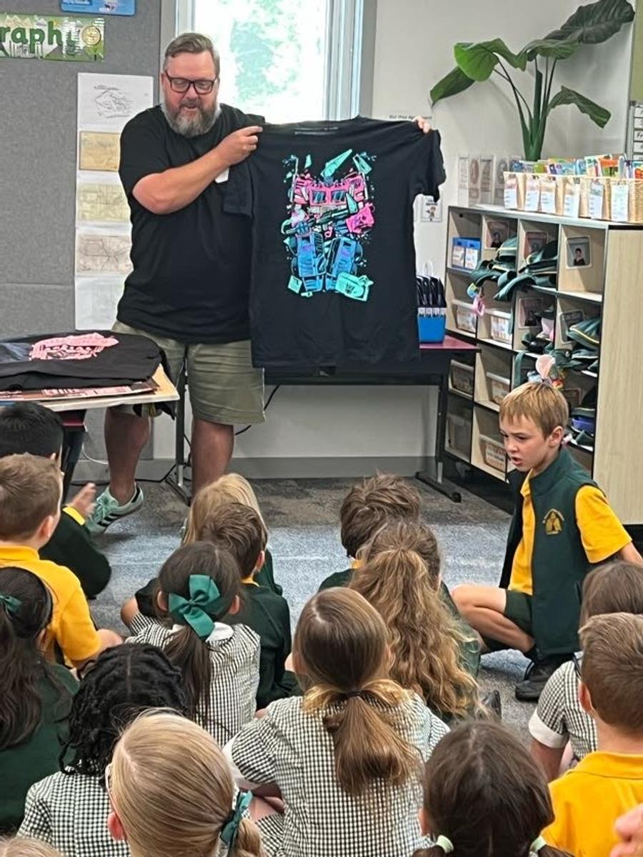 Travis spoke with the students about his art journey and showed us some of the many designs he has created.