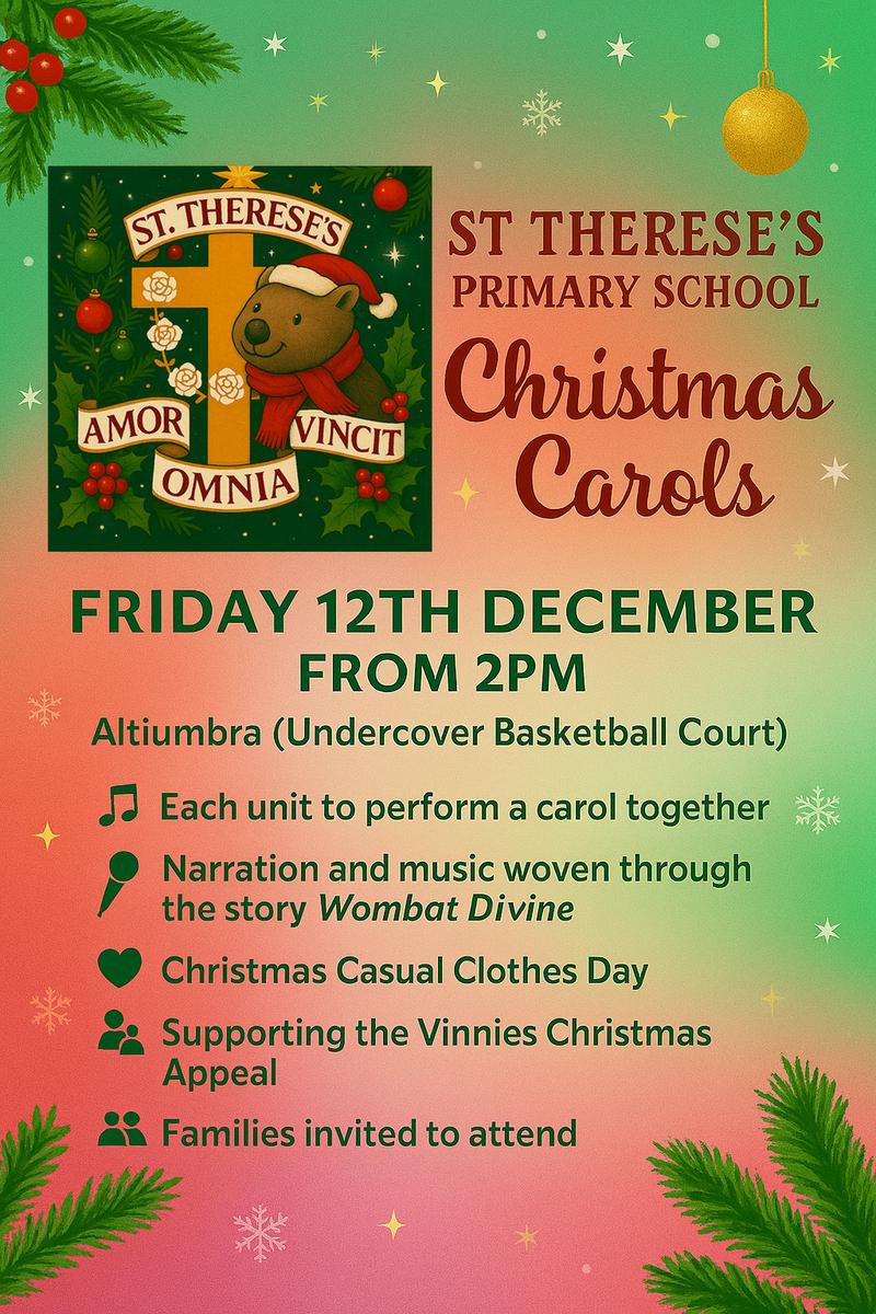 To celebrate the end of year, we will be holding Christmas Carols in the Altiumbra at 2pm on Friday 12th December. Each class will present a carol that connects with the story Wombat Divine, accompanied by simple movement sequences developed during Performing Arts lessons. The day will also be a Christmas Casual Clothes Day in support of the Vinnies Christmas Appeal. Families are all welcome to attend and enjoy the festivities.