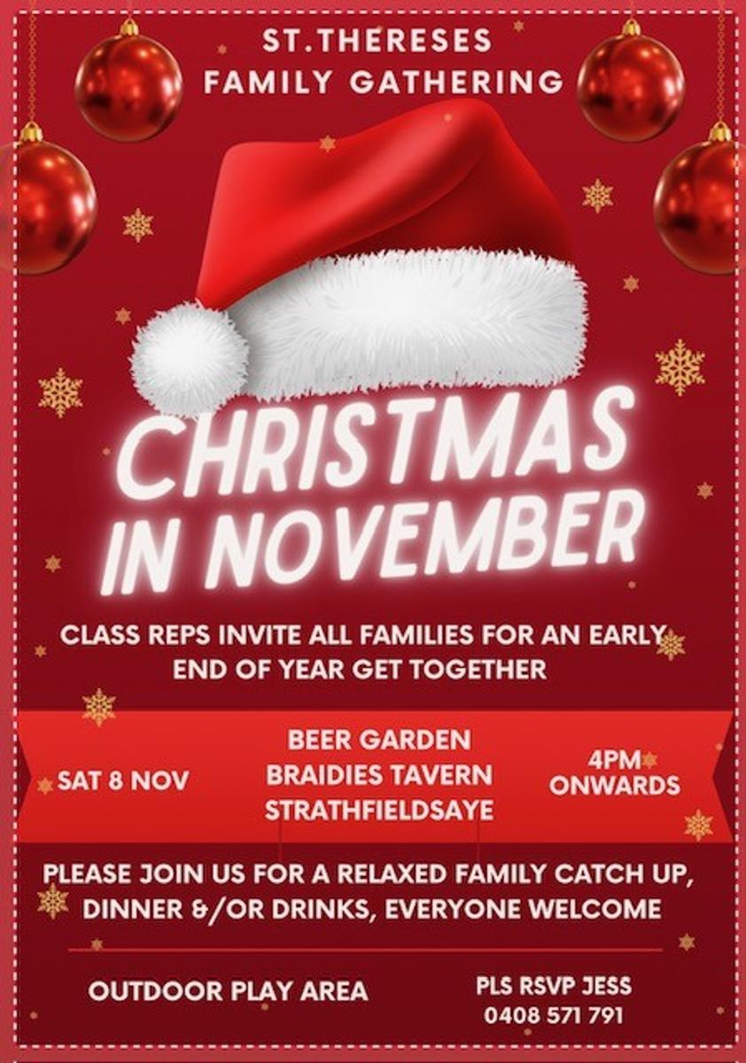 “Why wait until December? Our St T's Class Reps invite you join us for Christmas in November—a night of family, fun, and festive cheer! Gather your friends and let’s celebrate early and beat the Christmas rush!”