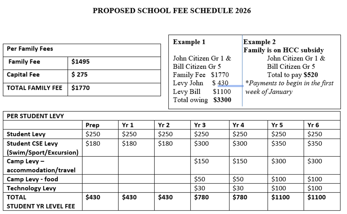 School Fee Intention Forms for 2026 will go home next week. Please fill out and return to school by the return date of 14th November. A reminder that if you are choosing the 'pay in full' option, once school has started, payment will be required by the end of term 1.
