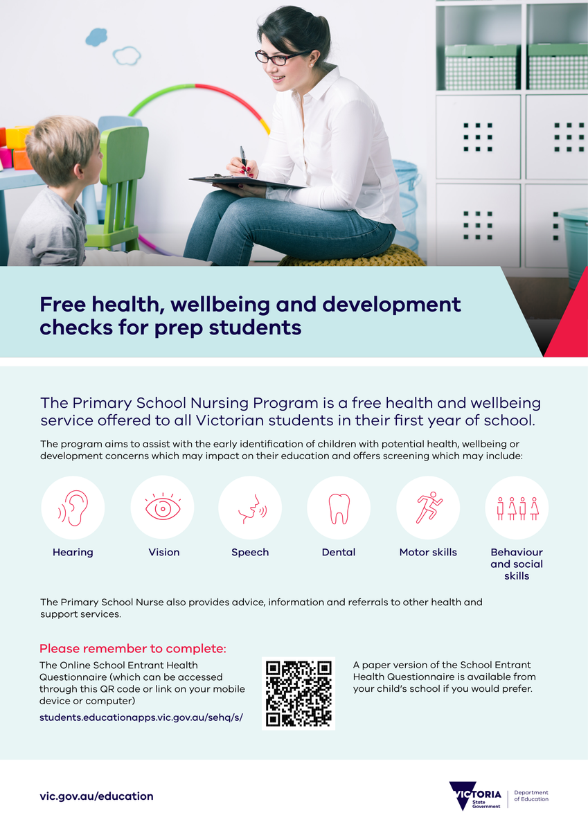 The Department of Educations School Nursing Program for Foundation students is commencing in November. On Monday, each Foundation child will bring home a white envelope with information regarding the program. This service is offered to all children enrolled in their first year of school and is essentially an extention of the maternal and health checks that your child had in earlier years. Completing this questionnaire enables you to raise any concerns you may have regarding your child's health and development. This is a quick online questionnaire. If you require a hardcopy, please let the school office know and we can send one home for you.
