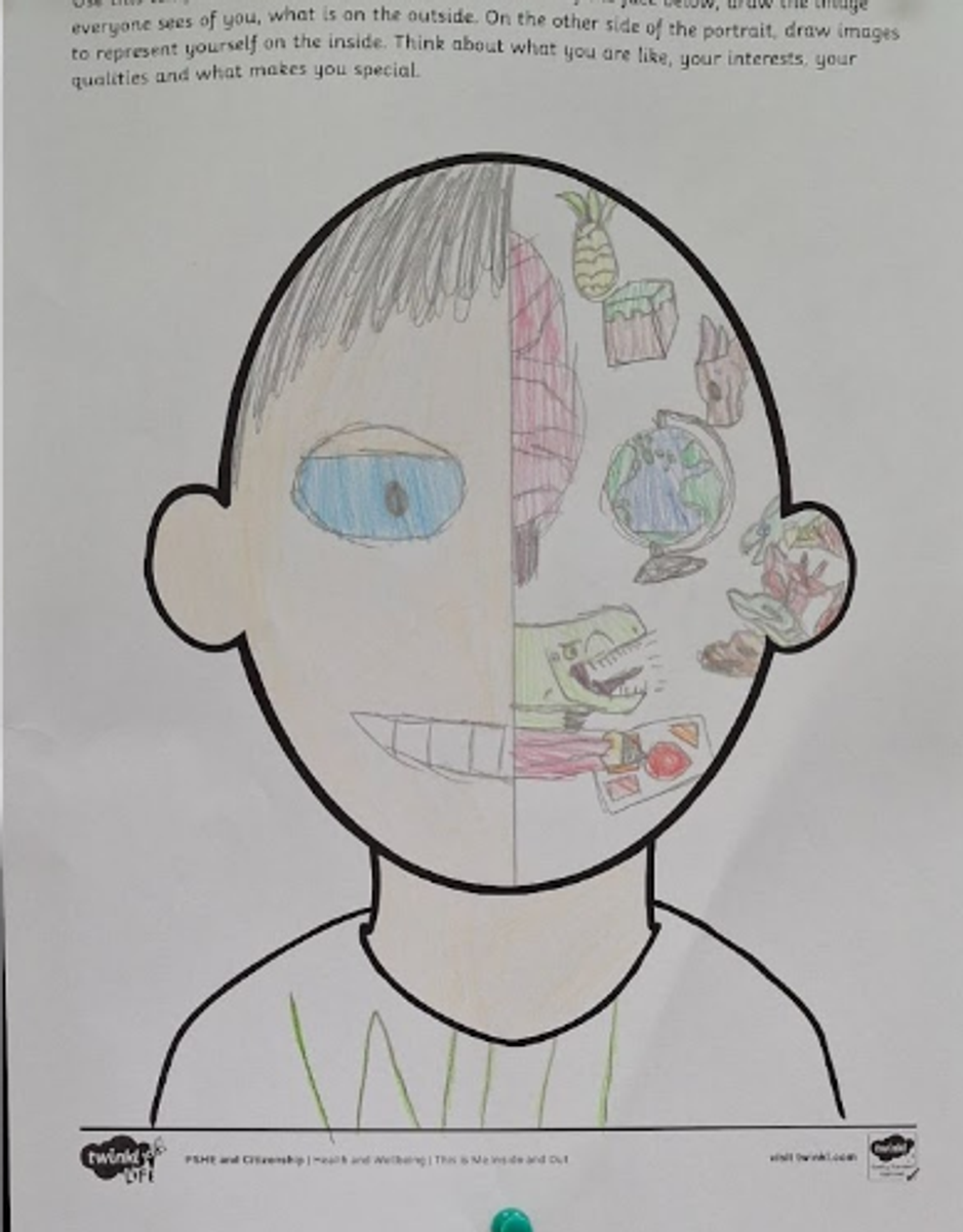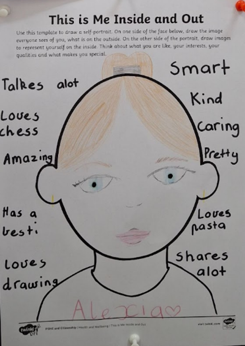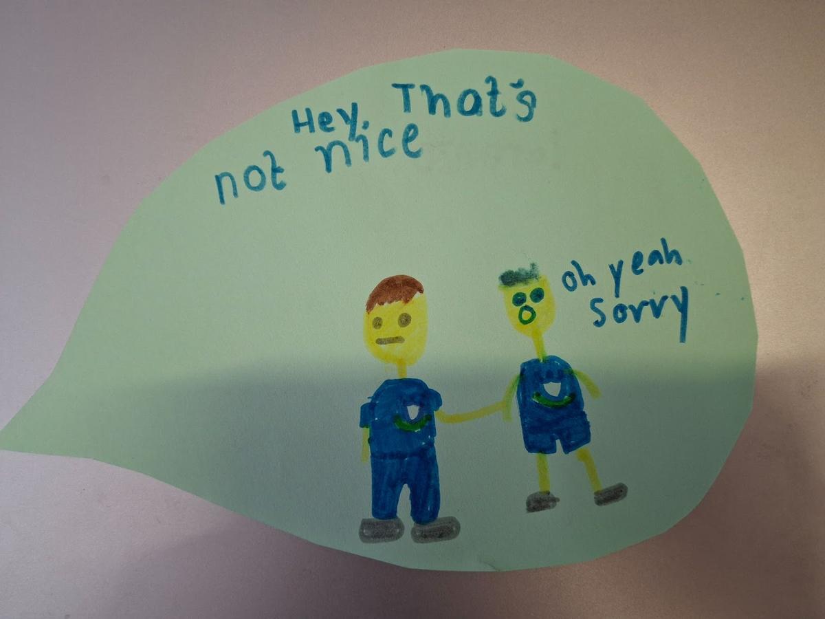 Here is some work from Grade 3-4s from Sessions 1 & 2. In session 1 we talked about what we love about our inner and outer selves. In session 2 we looked at ways to be an upstander when we hear people commenting negatively about bodies. In the speech bubbles are some things an upstander could say.