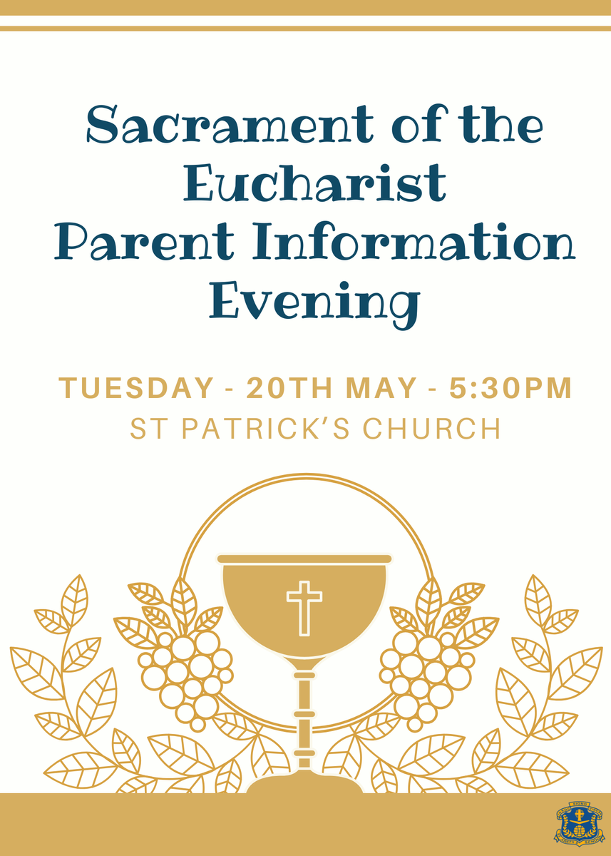 This year, the Sacrament of First Eucharist will be held on Sunday, Tuesday 15th of June at 9:00am at St Patrick’s Church for students in Year 3. There will be a Parent Information Meeting tomorrow, 20th May at 5:30pm held in our St Patrick's Church. It is expected that at least one parent attends this short meeting. Children do not need to attend this meeting.