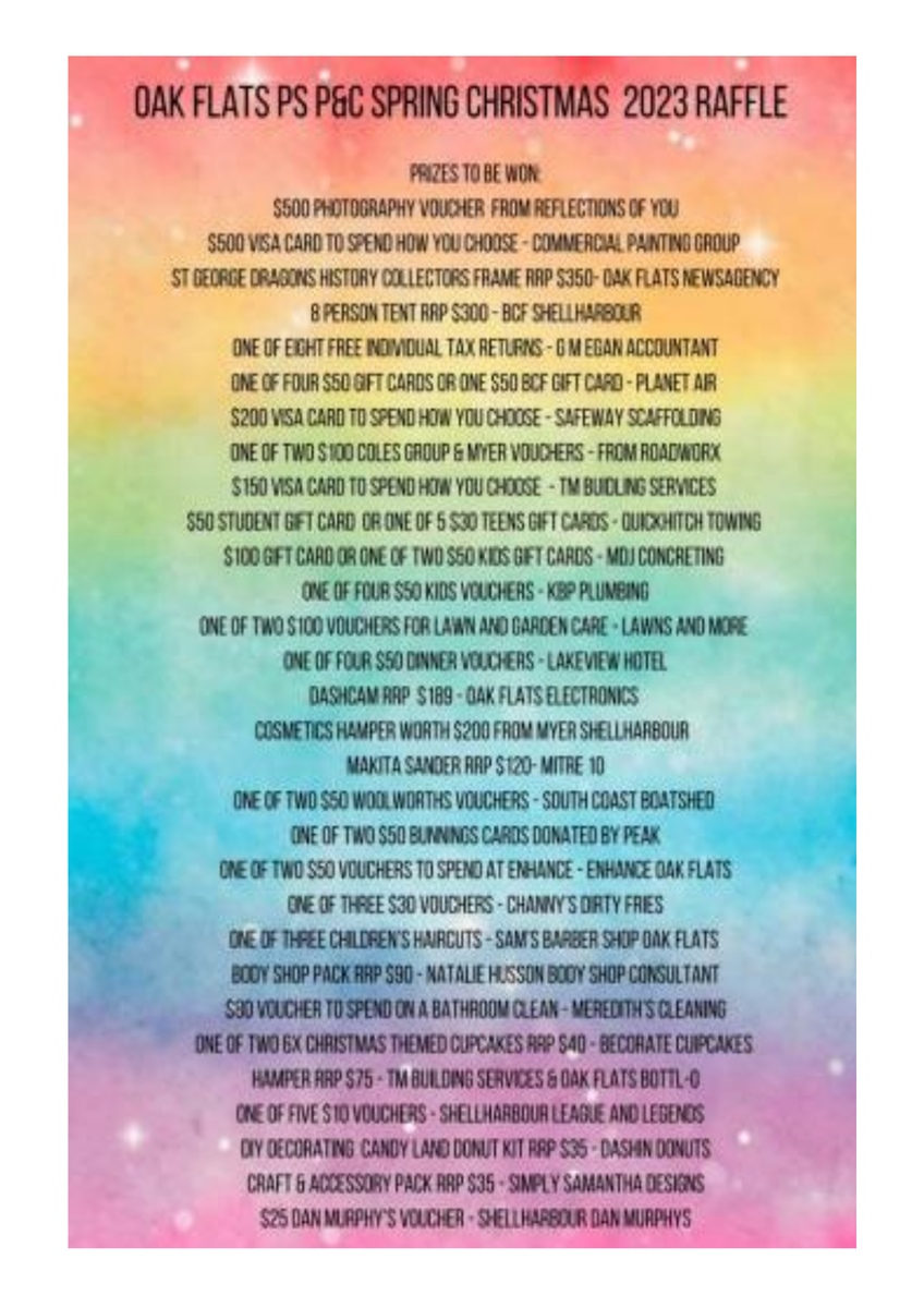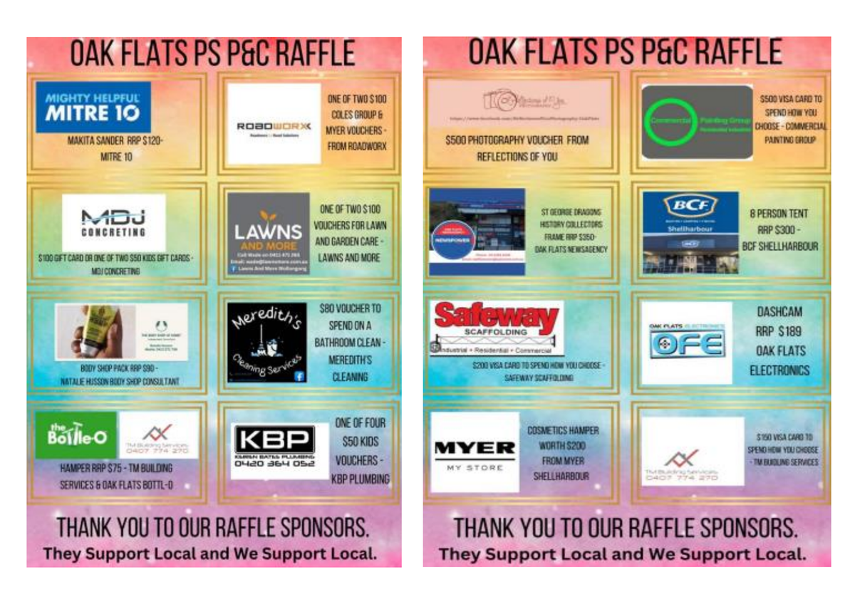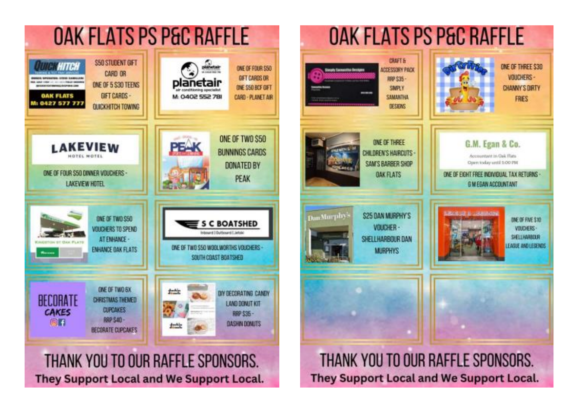 We’ve had an extremely generous response and support from our local businesses for this to happen. We are thrilled to have over $4,900 worth of prizes to be won from 30 x sponsors just in time for Christmas shopping and gifts! Massive thank you and appreciation to these local businesses for their generosity and to Emma Michell for organising many of these prizes.
