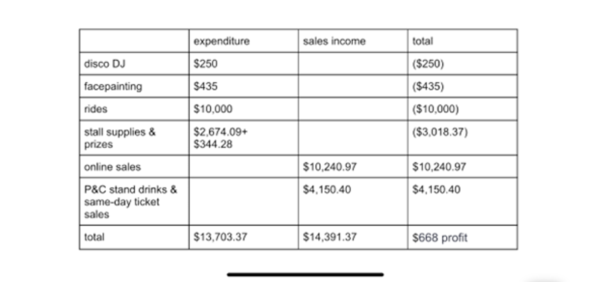 I am pleased to provide details on the financial outcome of the day, see below. Well done to our students and their families, the school staff and our committee for a successful outcome all-round.
