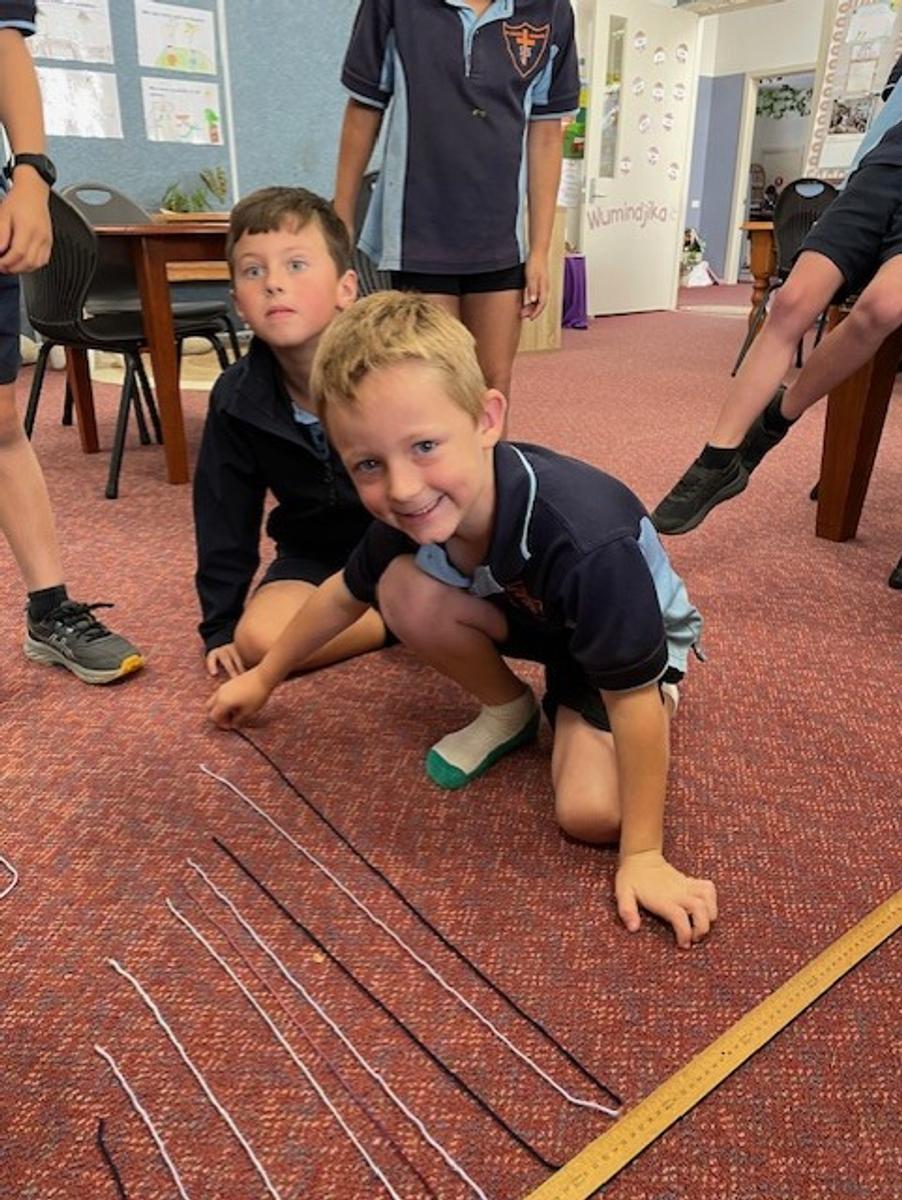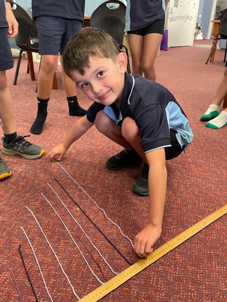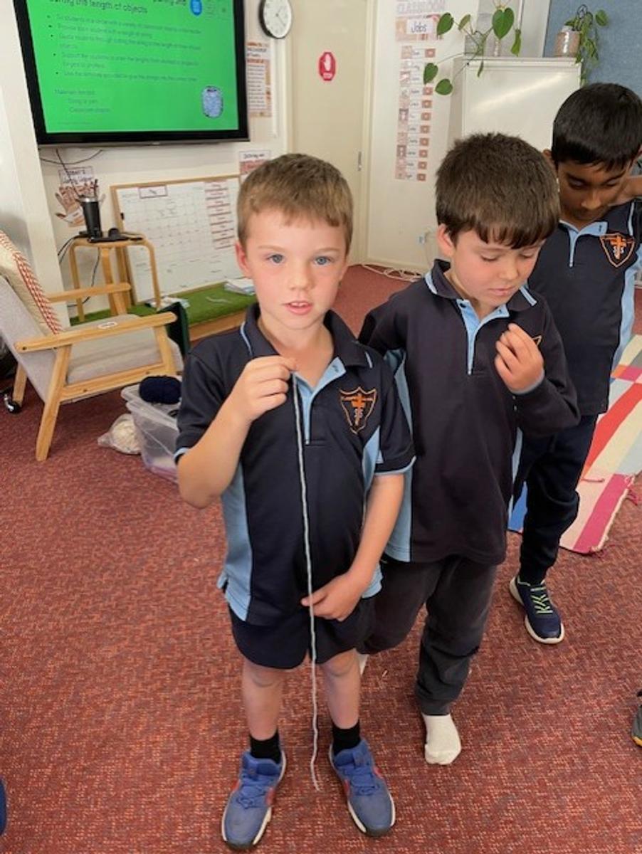 We have been looking at measurement this fortnight, focussing on length. We began our unit by measuring the Cross Country course through MacKillop Walk using a metre wheel and counting in 5 metre increments, with Finley, Huda, Adam, Grace and Aahn tallying as we went. We are now looking at comparing lengths using informal measurements such s string, and using terms such as shorter and longer.