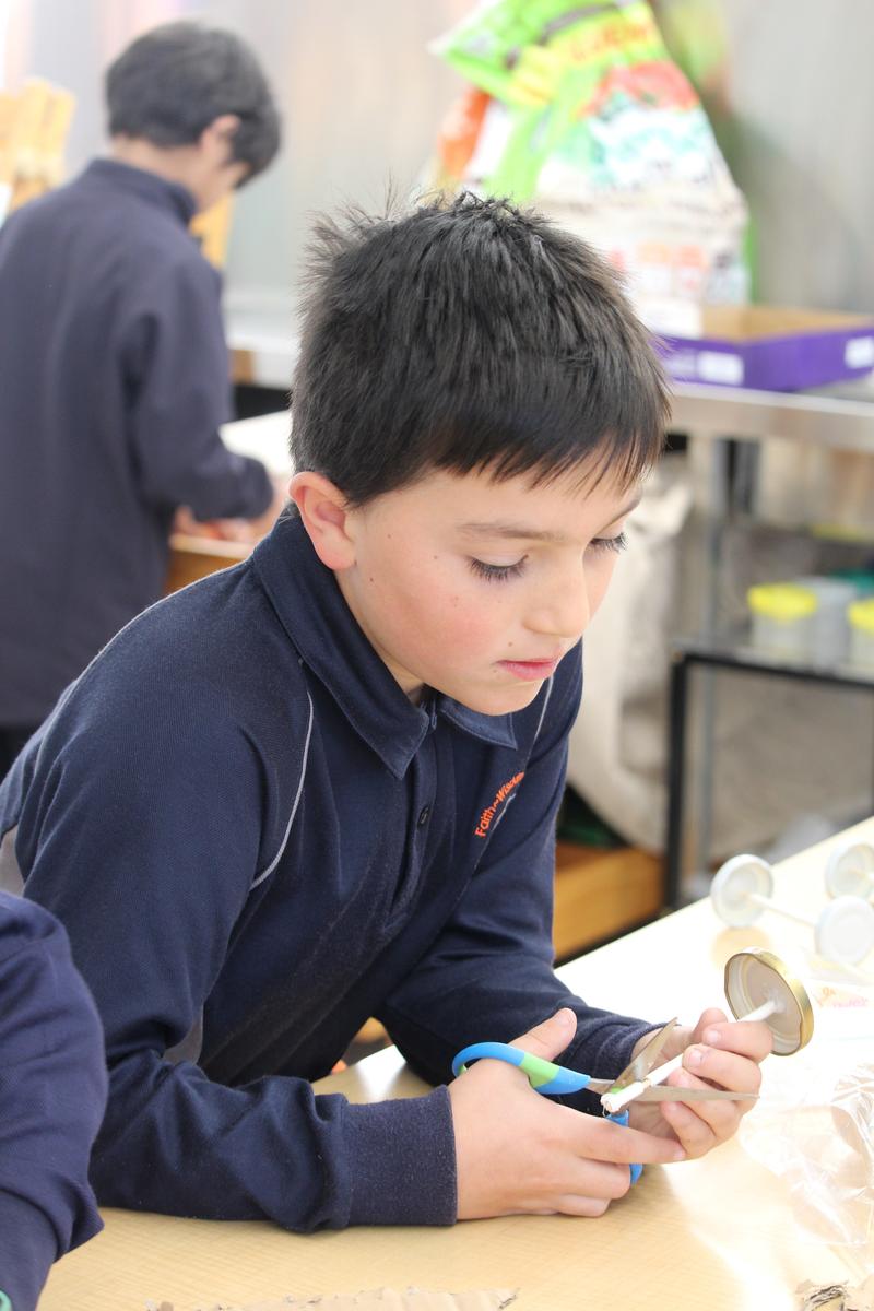 “We are making axles and wheels. We use circles of wood, metal and plastic lids and glue with a hot glue gun to a long piece of wood. Then we tested them out to see if they worked.” - Noah H & Tylan