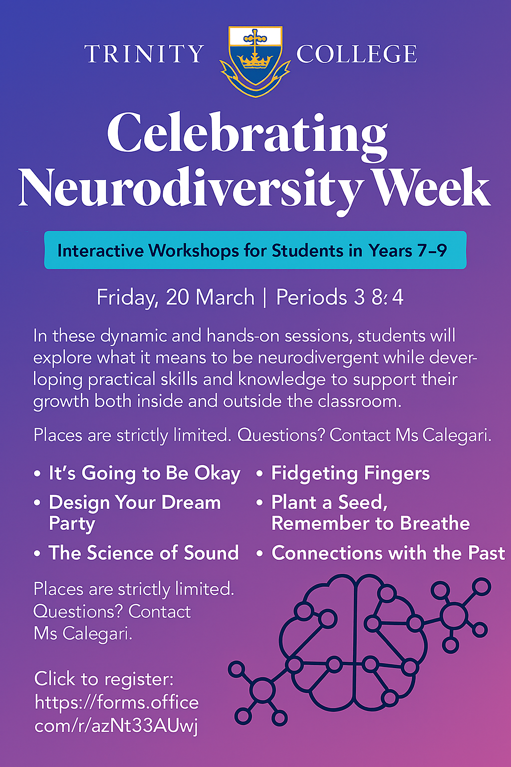 Week 8 marks the beginning of Neurodiversity Week; a time to celebrate neurodivergence and build awareness across our community. This year, Trinity College will be hosting an afternoon of interactive workshops for selected students in Years 7–9 on Friday 20 March, during Periods 3 and 4.