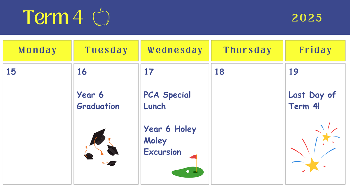 Term 4: Monday 6 October - Friday 19 December (Finishing 1:15pm)