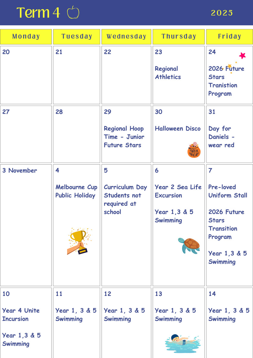 | Year 1, 3 & 5 School Swimming Program | Monday, 3 November |