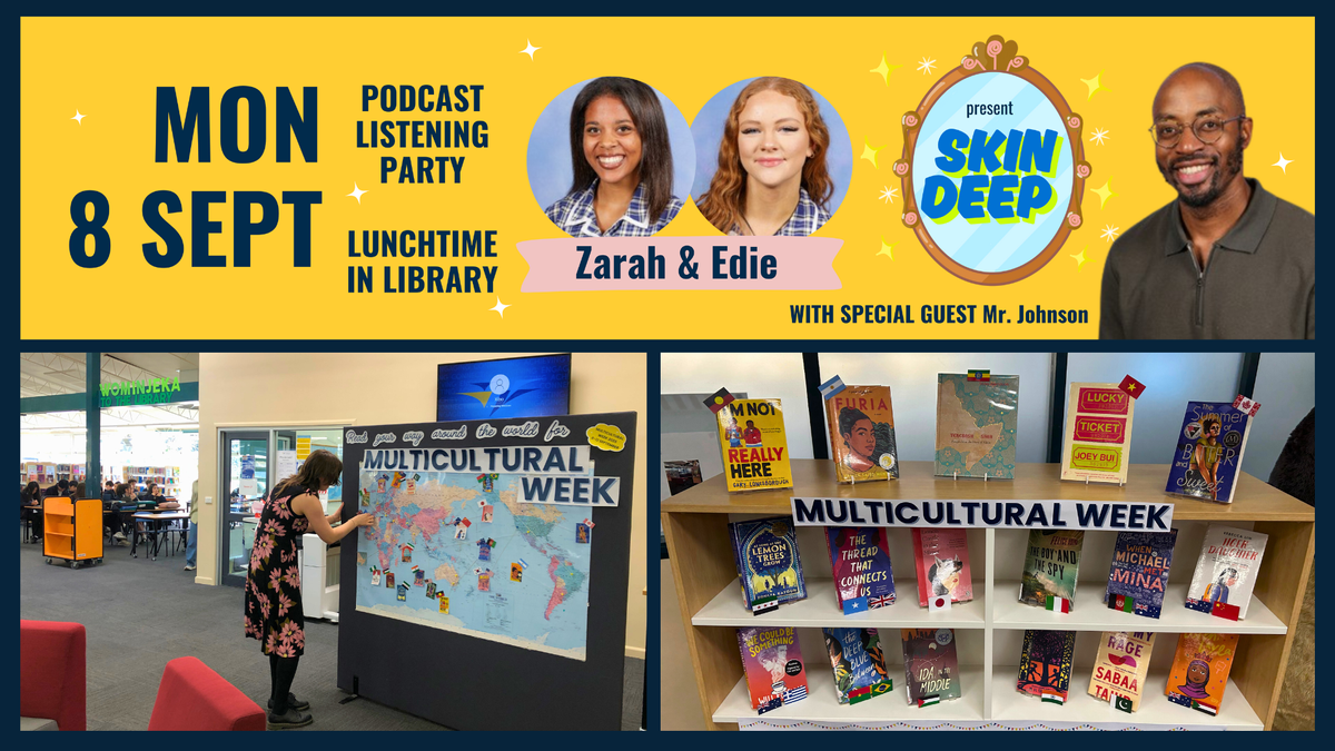 Multicultural Week began in the library with a Podcast Listening Party led by Year 10 students Zarah Powell and Edie Slater. As part of the Culture Committee, Zarah and Edie first developed their podcasting skills at a workshop at Arts Centre Melbourne before creating and recording their own episode.