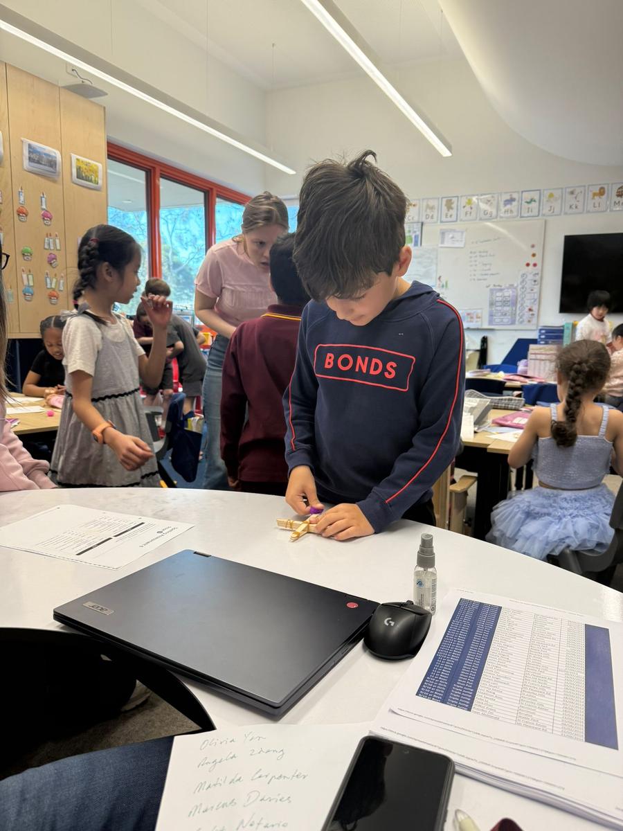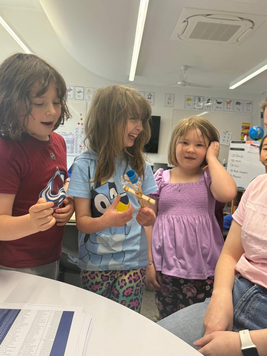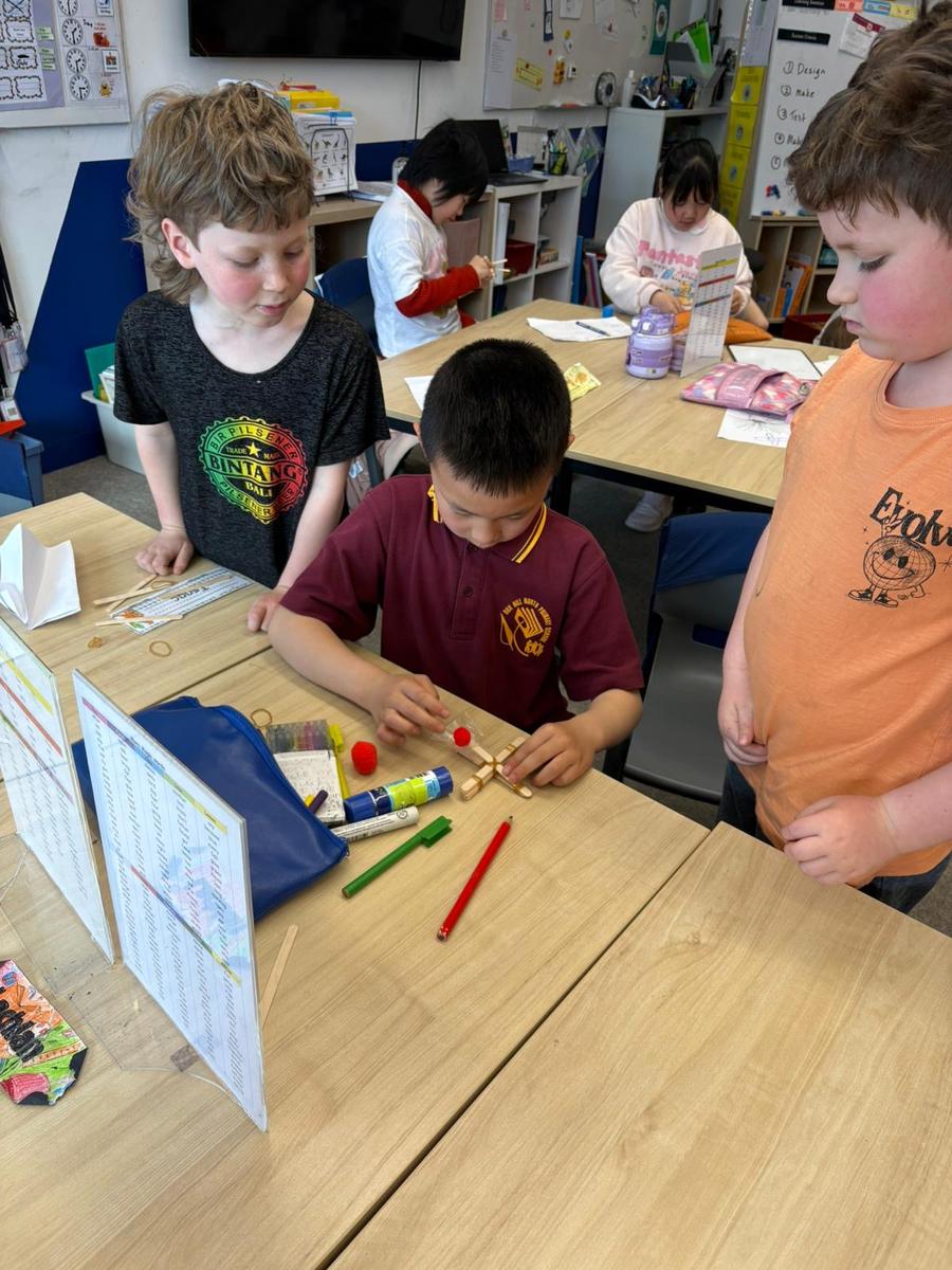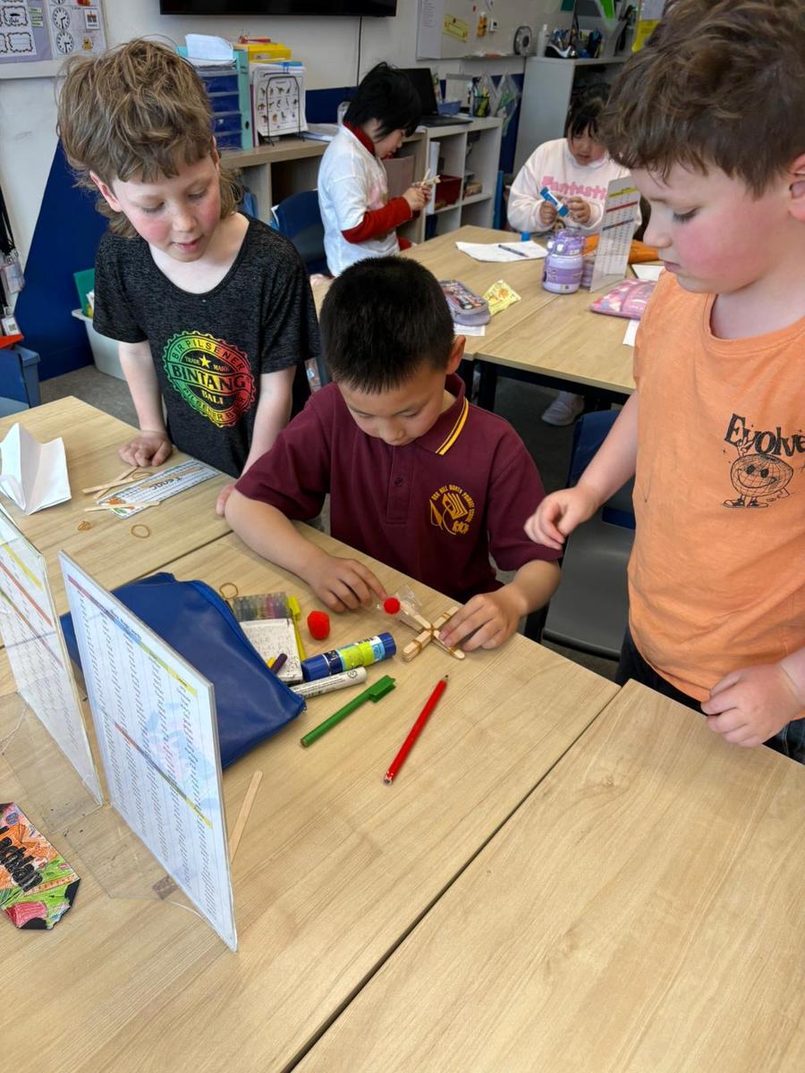 We celebrated our learning by having a STEM challenge where students worked in small groups to design and create a catapult made out of icy pole sticks and rubber bands. They then measured how far the pom- pom flew from their catapult. Some students even compared the distance of their pom-pom to their friends.
