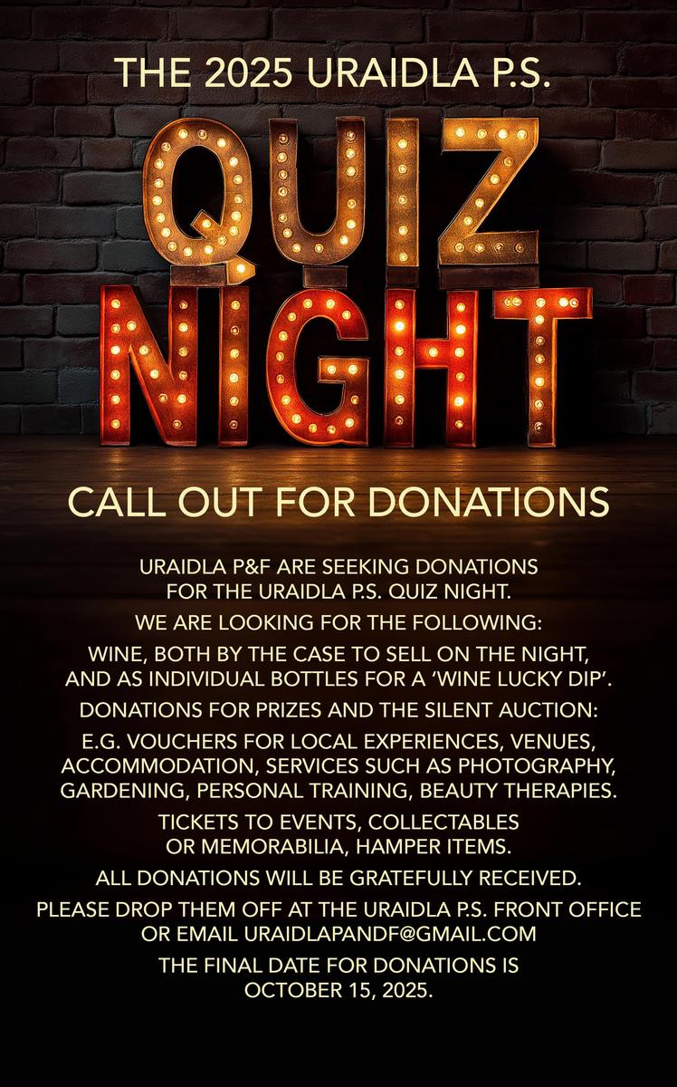 If you would like to donate any services or items that can be used as prizes or silent auction items on the night, please drop items to the front office at Uraidla Primary School or email uraidlapandf@gmail.com