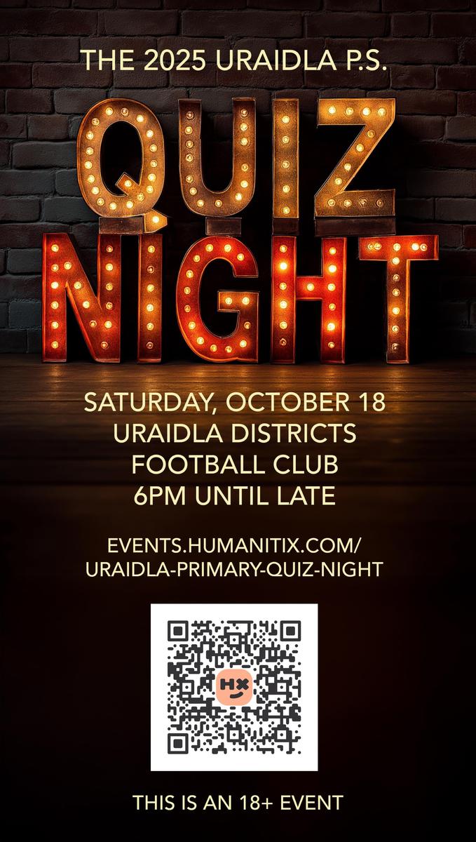 Uraidla P.S. Quiz Night Saturday October 186 pm to 10 pm. Uraidla Districts Football/Cricket Club. This is an 18+ event.