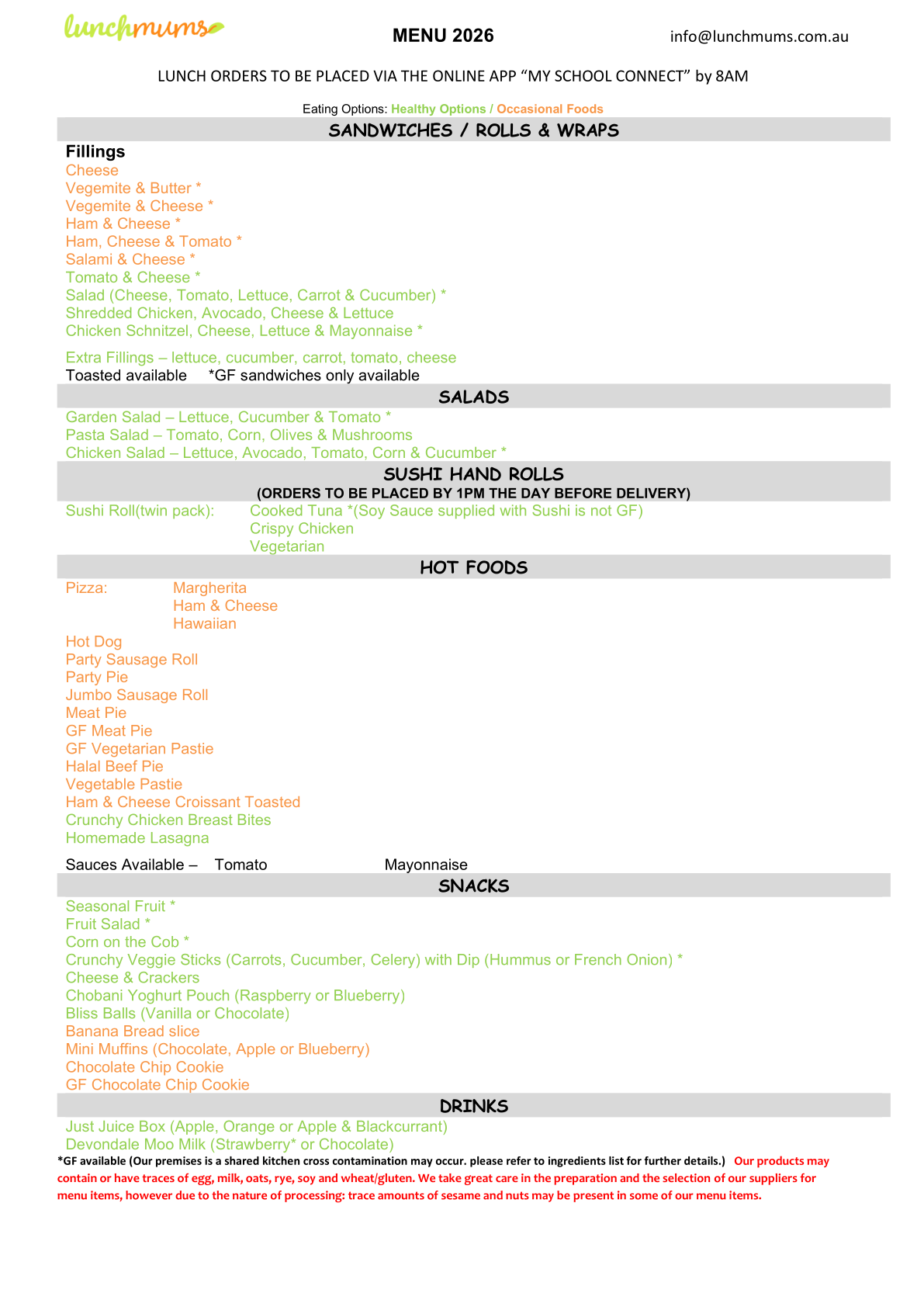 Lunch orders are to be placed via the online app "My School Connect" by 8.00 am on the Thursday.  Orders are delivered by 1.15pm every Thursday. Please see menu and online instructions below: