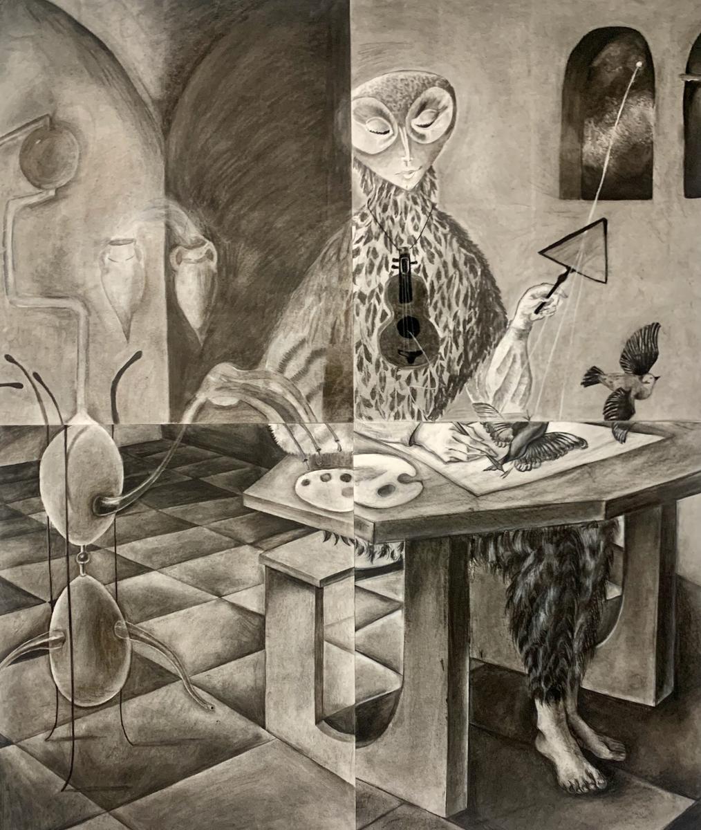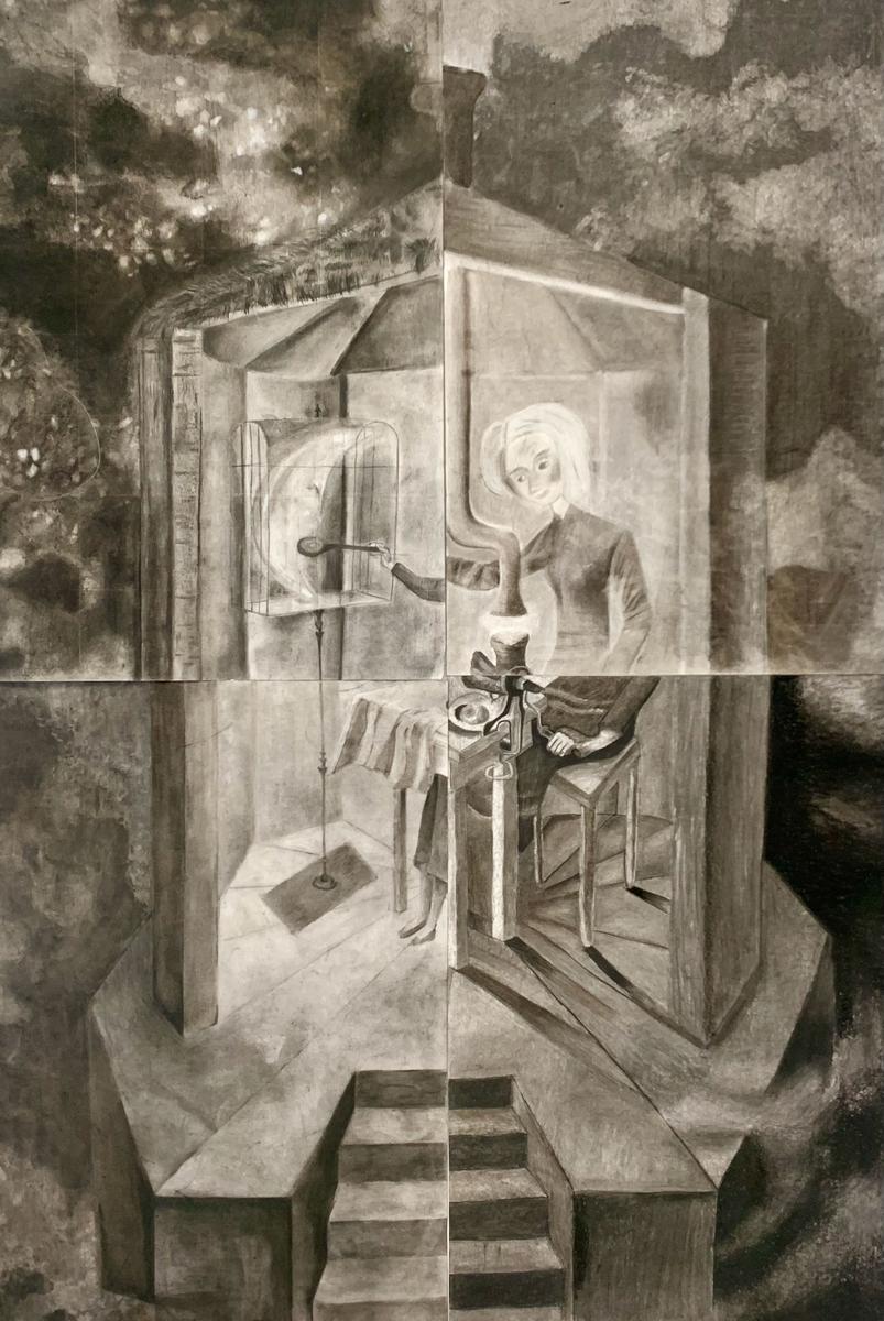Leonora Carrington, Evening Conference, 1949, Oil on Canvas. Reproduction by Rachel Song, Izzy Pirro, Chloe Manuell, Isabelle Downie.