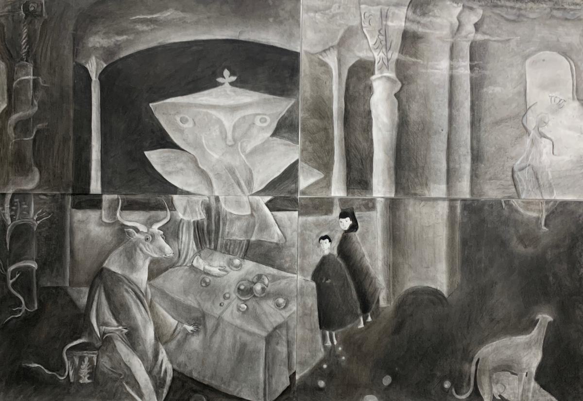 Leonora Carrington, And Then We Saw the Daughter of the Minotaur! Oil on Canvas. Reproduction by Marleaux Gallup, Eva Lopez, Lara Le, Sophie Watson.
