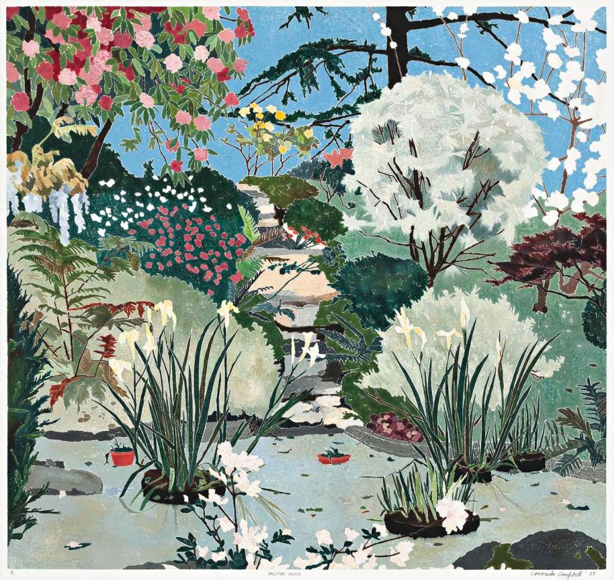 Cressida Campbell, Milton Park, 1989, colour woodblock print. Reproduction by Maggie Fleming, Lulu Higginbotham, Sydnie Hoskin, Alexis McCarthy.