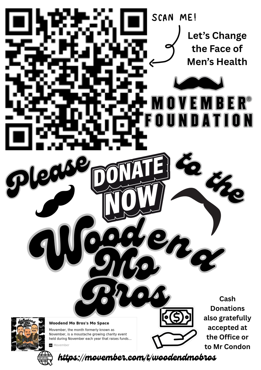 Throughout November, please remember to remind the men in your life to take care of their physical and mental well-being. If you would like to support the cause and encourage the moustache magic, you can donate online through the team’s fundraising page “Woodend Mo Bros” using the link or QR code below. Cash donations can also be made directly to Mr Condon or at the school office.