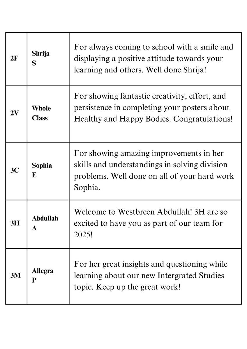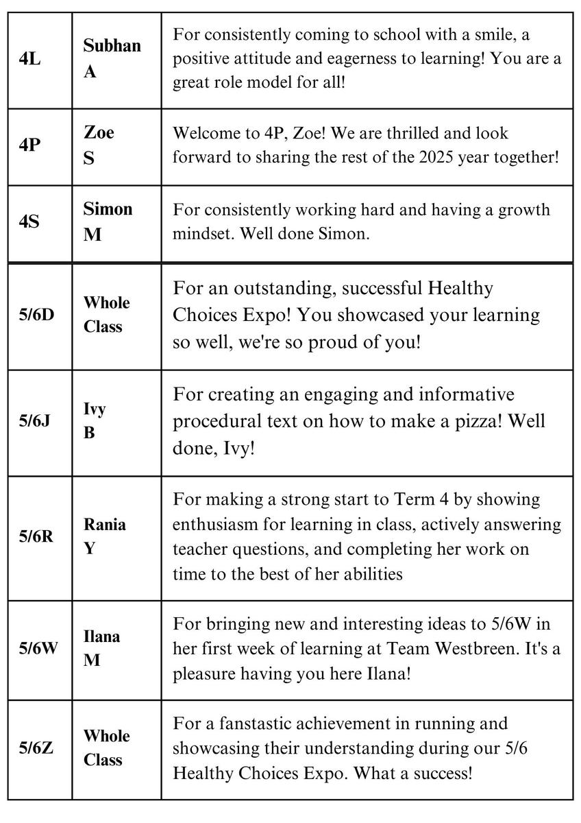 Each week at Team Westbreen, we celebrate students demonstrating our school values at our assembly together on Wednesday mornings at 9:05 am. All families are welcome to attend.