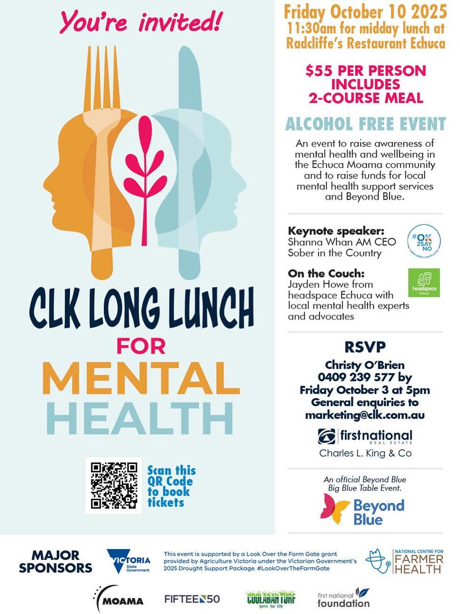 First National Charles L King & Co (Echuca Moama, Vic) will once again host its Long Lunch for Mental Health on Friday 10 October, building on the success of last year’s inaugural event.