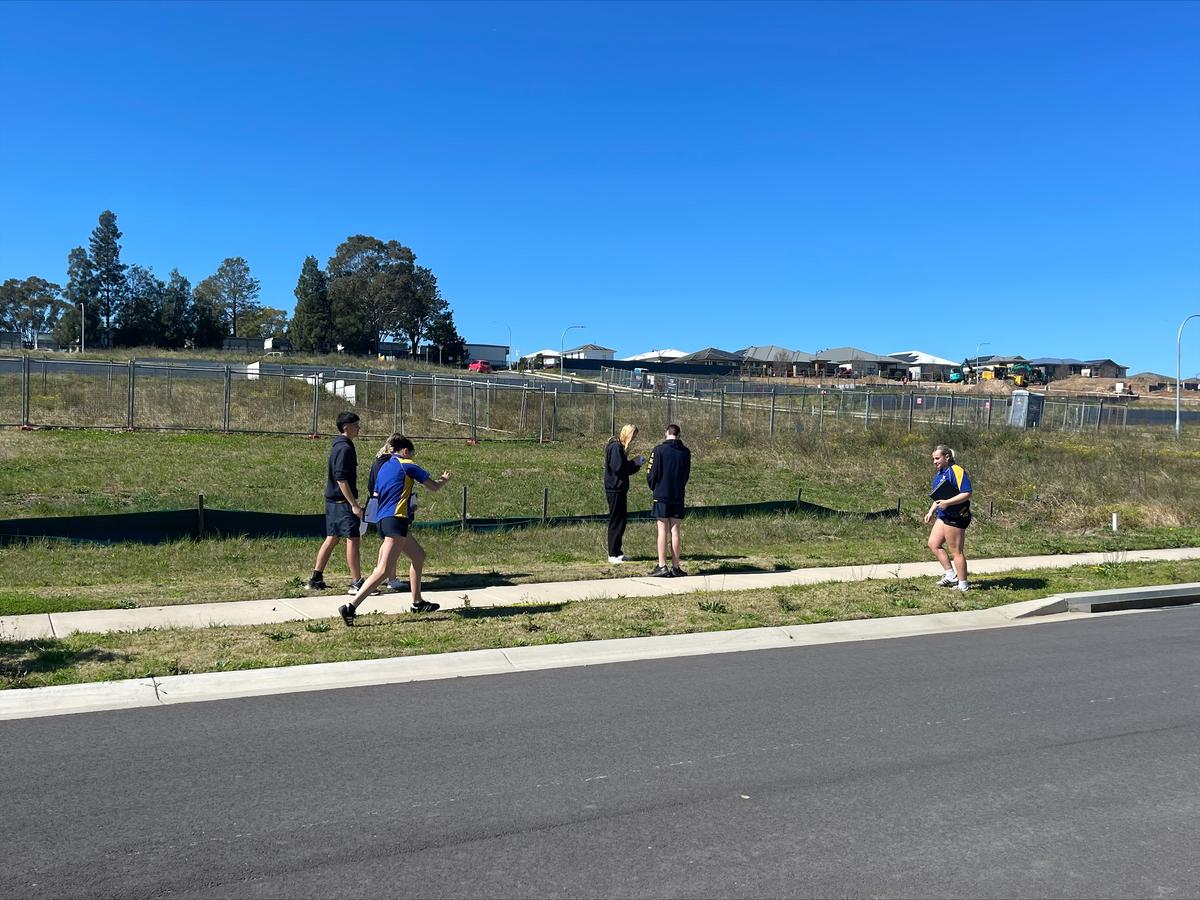The day began at Wood Street Park, where students tested soil permeability. After recent heavy rain, they discovered poor drainage was contributing to waterlogging and increasing flood risks. To extend this investigation, the group visited the new housing development at Gillieston, where they mapped drainage infrastructure and considered how design can influence flood prevention strategies.