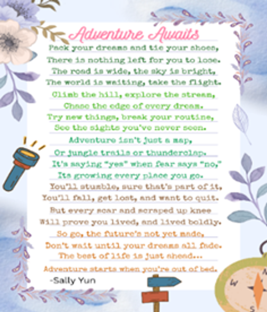 A special mention goes to Sally Y. (8D) for winning both the Poetry and 50-word Short Story Writing competitions. Her work showcased exceptional creativity, aligned with the Book Week theme Book an Adventure, and reflected the school value of EXCELLENCE in both poetry and short story writing. Please enjoy her winning entries below: