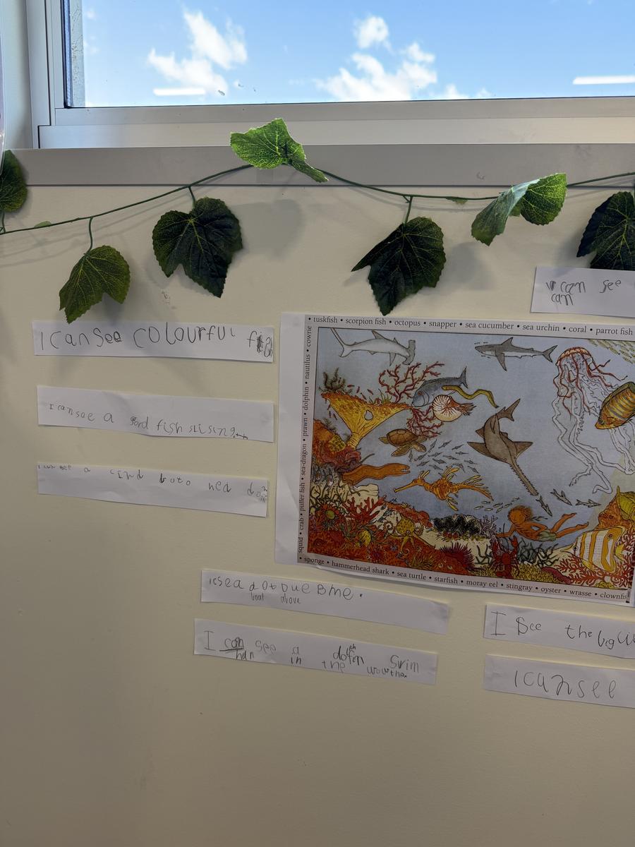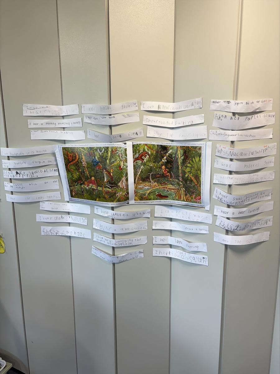 Students enjoyed looking at the beautifully detailed illustrations that Alison Lester includes. They have been recording sentences about the pictures using their five senses: see, hear, taste, smell and touch.