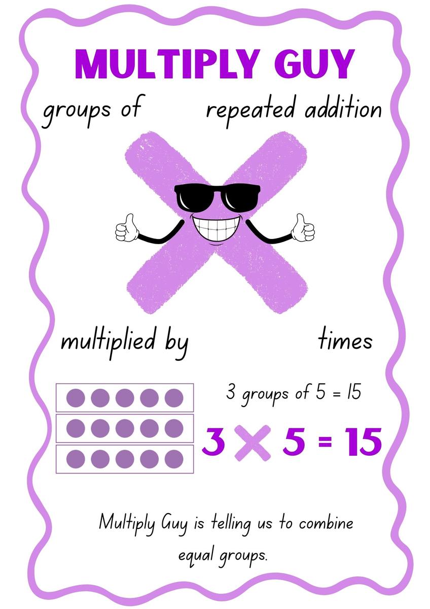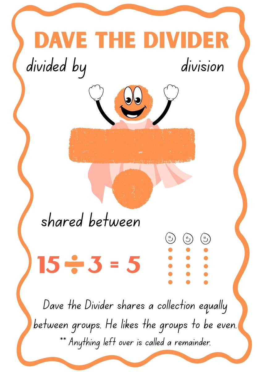 You might've heard your children talking about 'Multiply Guy' & 'Dave the Divider'. These are our Multiplication & Division characters used to teach all about the concept and skills needed to solve maths problems with these symbols.