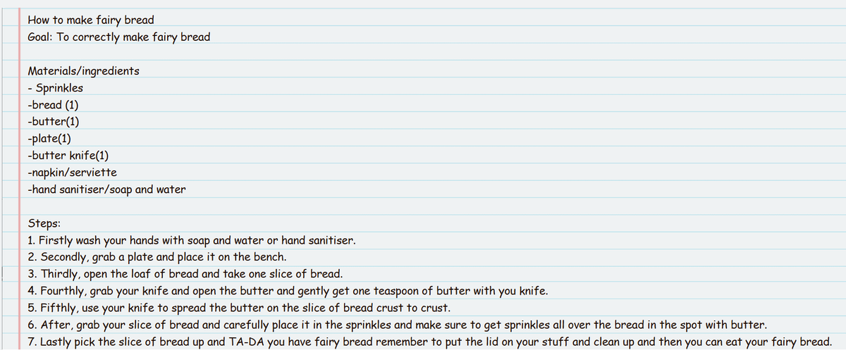 They were required to write and follow a procedural text on ‘How to make fairy bread’ and followed a procedure to conduct a Science Experiment titled ‘Magic Milk Experiment’.