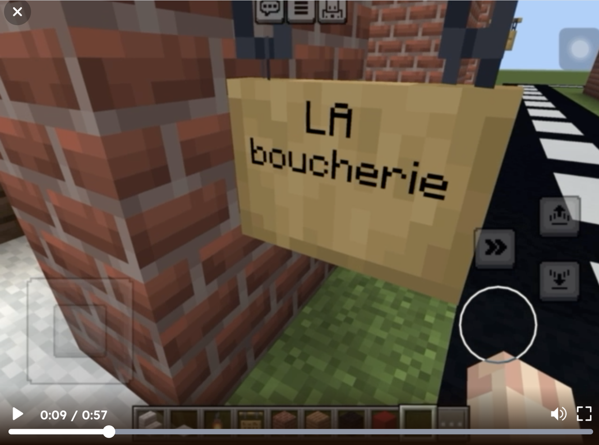 Students this term have been looking at different businesses and places you would find in a town, and using directional language to move around the town. They have recently completed their Common Assessment Tasks for the semester, and their work will be coming home in their black folders at the end of the year. In addition to their Common Assessment Tasks, they have completed a design project in Minecraft where they will upload a video of their avatar moving around the town, labelling the buildings in French and saying which directions they are moving in. Below are some photos of their videos so far. It has been lovely to see their hard work this term, learning words to say aloud, listen to, write and read to understand. I am very proud of how hard they have worked and the high level of French they achieved in their CATs.
