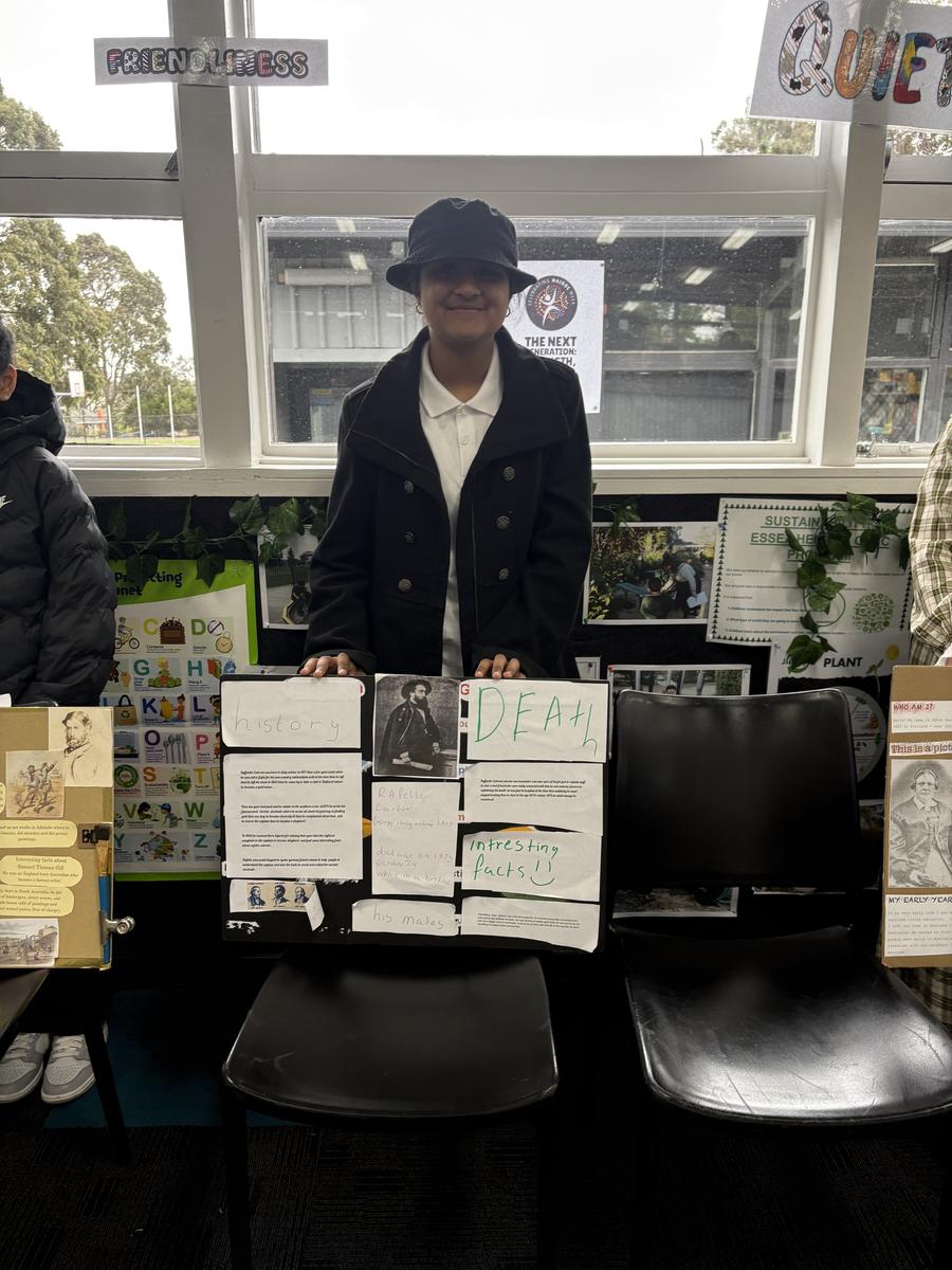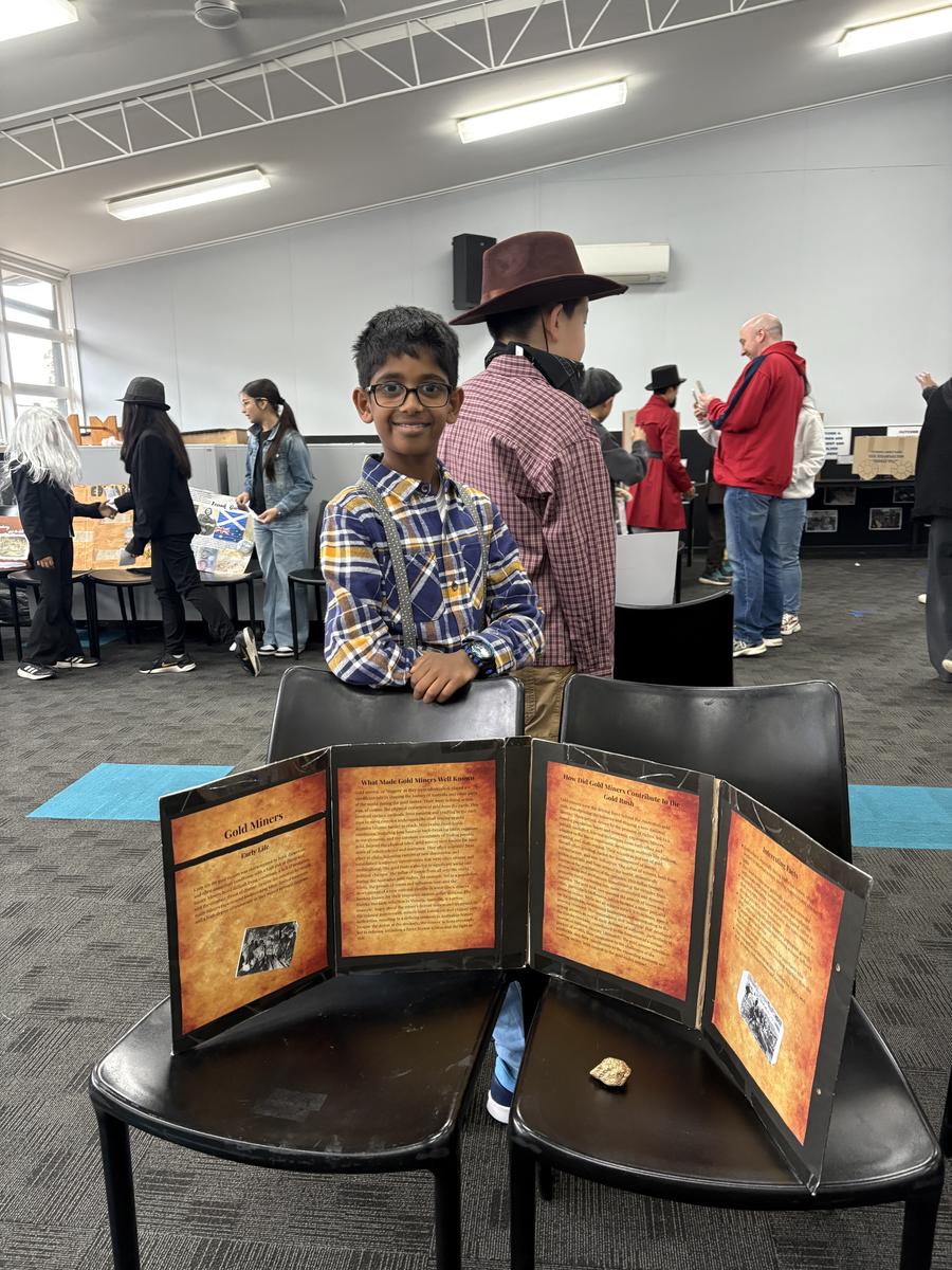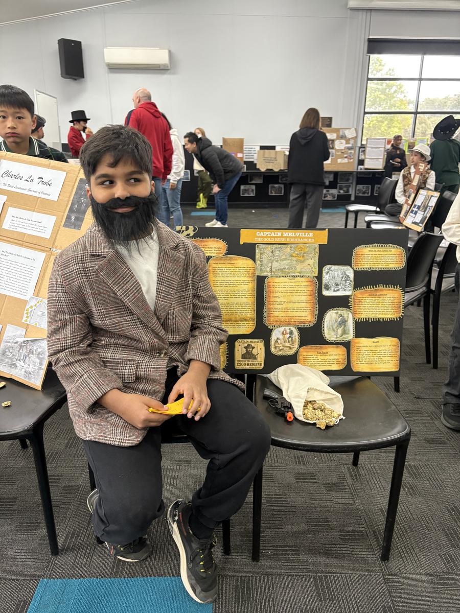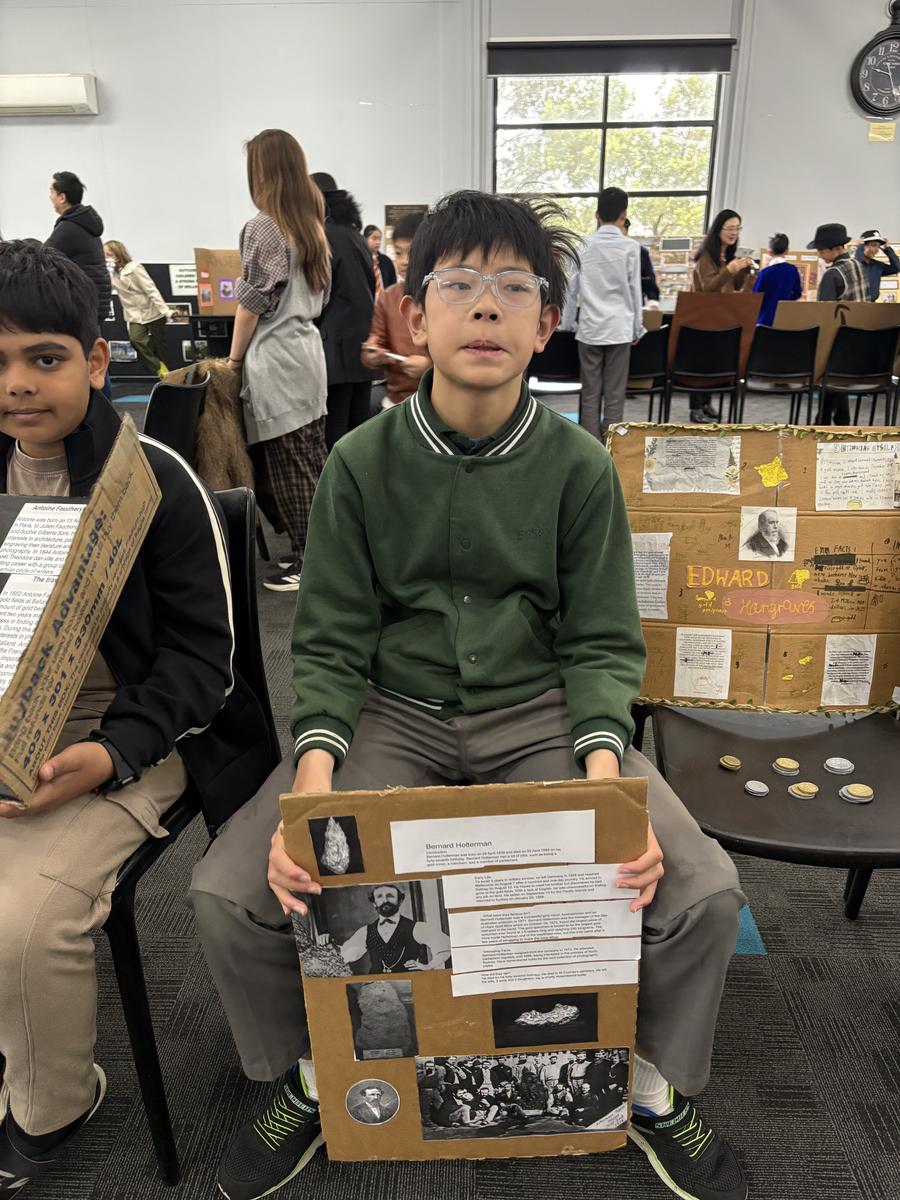 The trip to Sovereign Hill that took place earlier last term, influenced many Year Five students to enhance their posters and costumes. On the day of the Living Wax Museum, the hall was set up as an exhibition space with each student displaying their own posters, artifacts and themselves, dressed as famous people from the Gold Rush. It started off with parents and carers visiting everyone's exhibits and listening to their well-written speeches. Afterwards, various classes started coming in and inspecting our posters and props. After a while, the whole school had visited the Living Wax Museum. The day was fun and great success for all the Grade Five students.