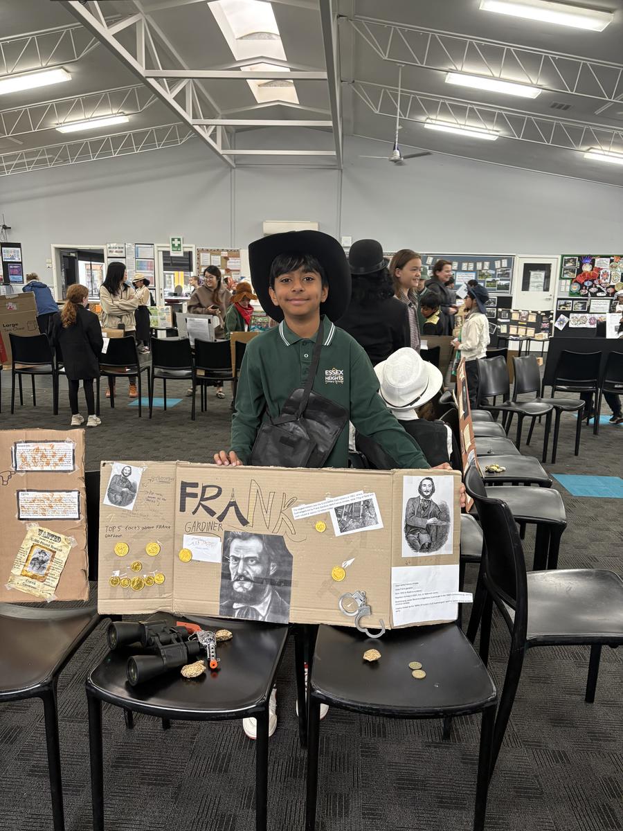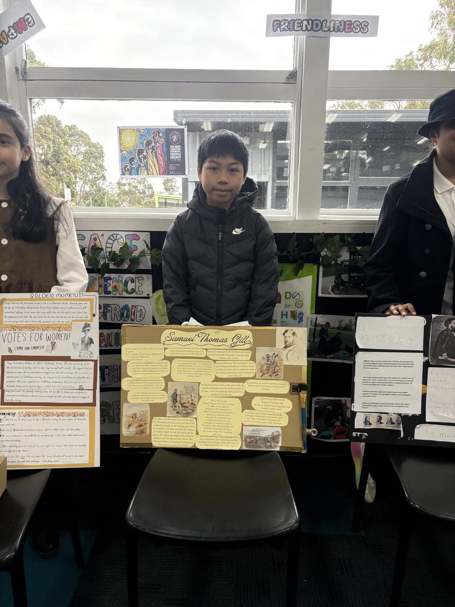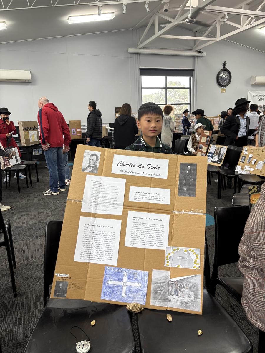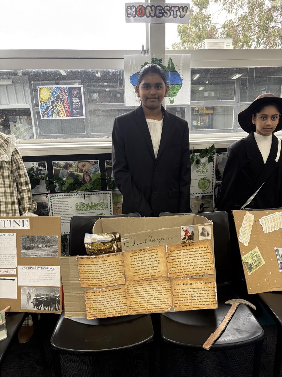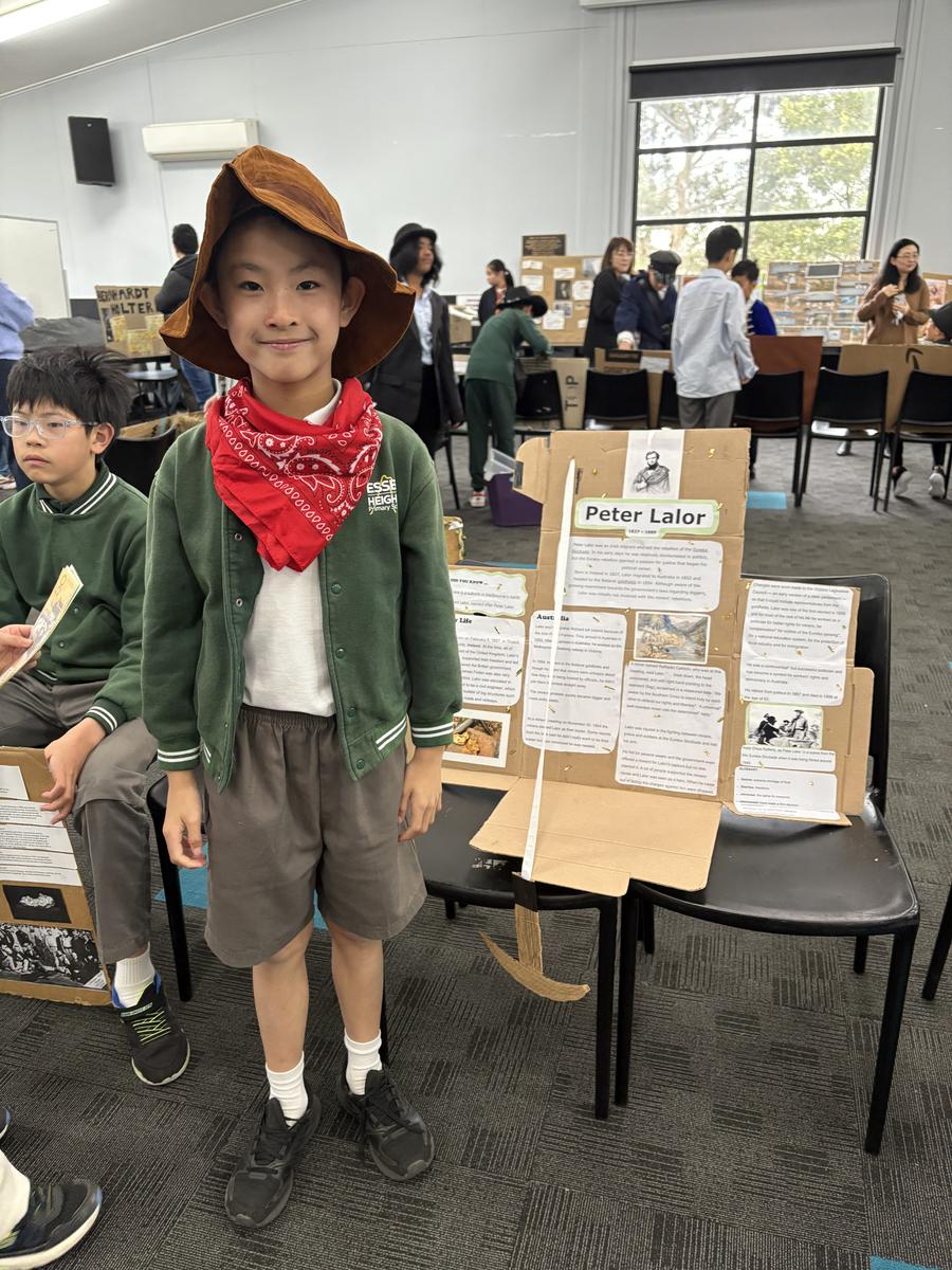 The trip to Sovereign Hill that took place earlier last term, influenced many Year Five students to enhance their posters and costumes. On the day of the Living Wax Museum, the hall was set up as an exhibition space with each student displaying their own posters, artifacts and themselves, dressed as famous people from the Gold Rush. It started off with parents and carers visiting everyone's exhibits and listening to their well-written speeches. Afterwards, various classes started coming in and inspecting our posters and props. After a while, the whole school had visited the Living Wax Museum. The day was fun and great success for all the Grade Five students.