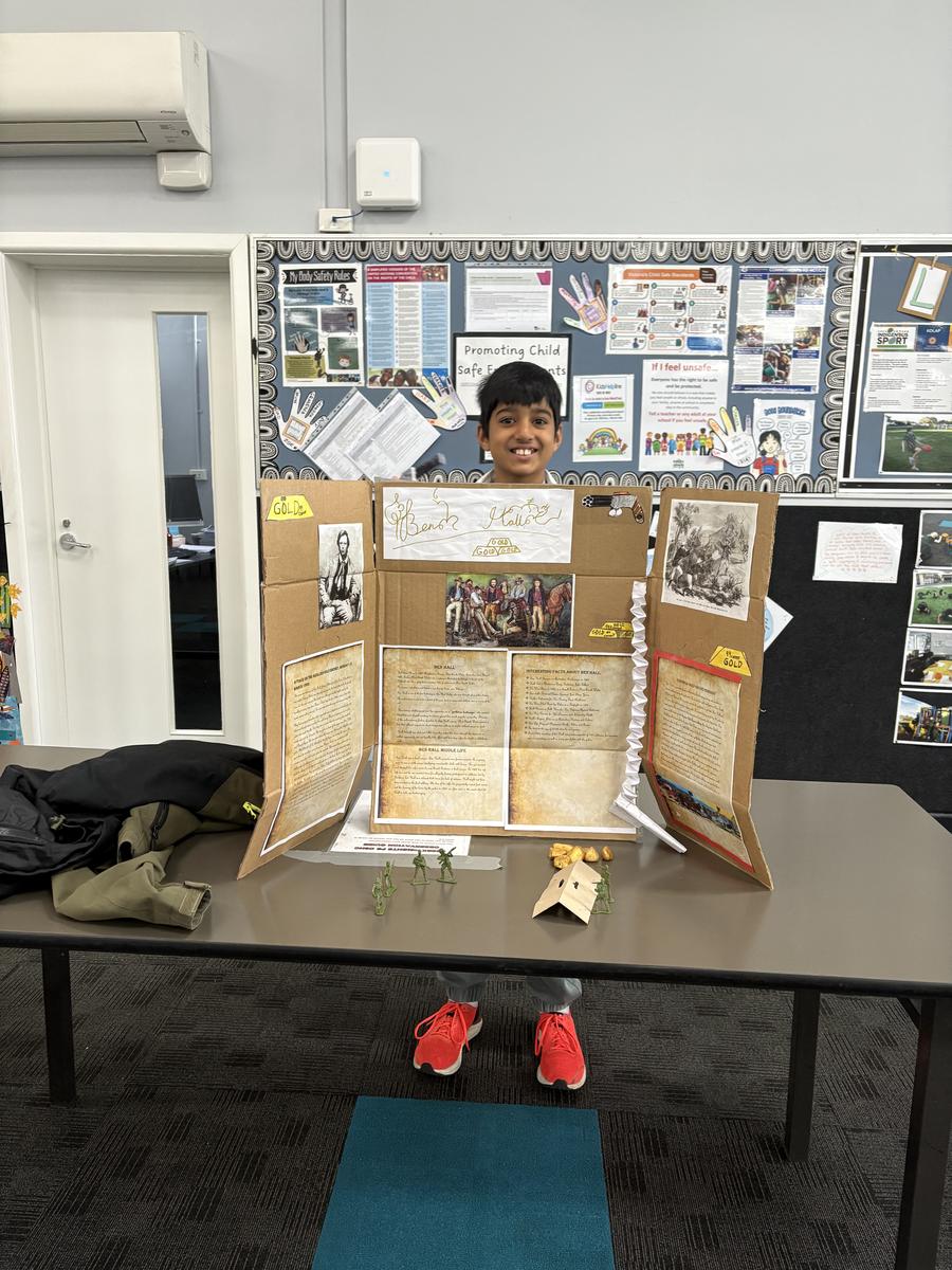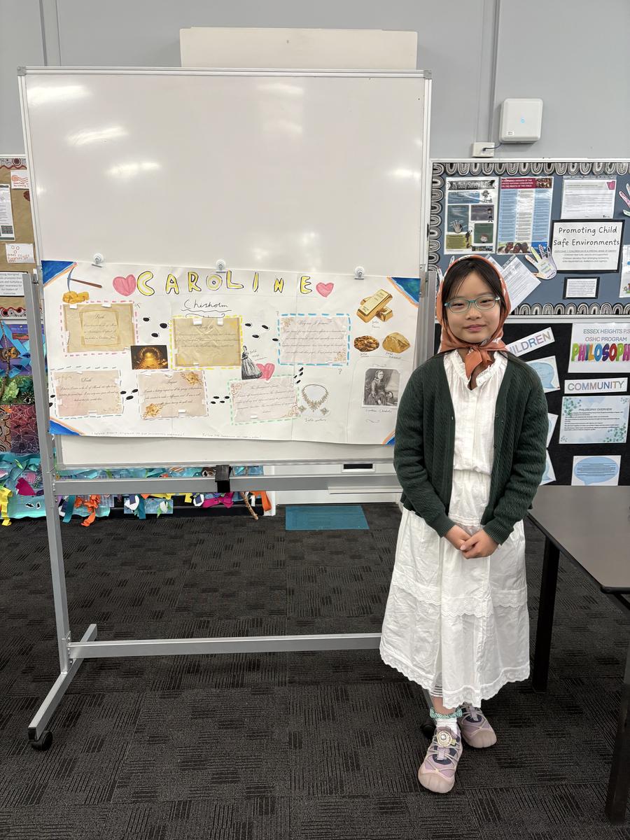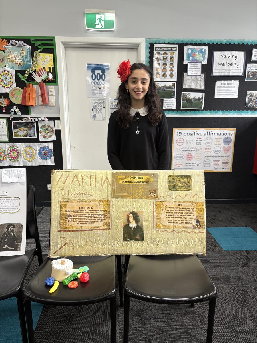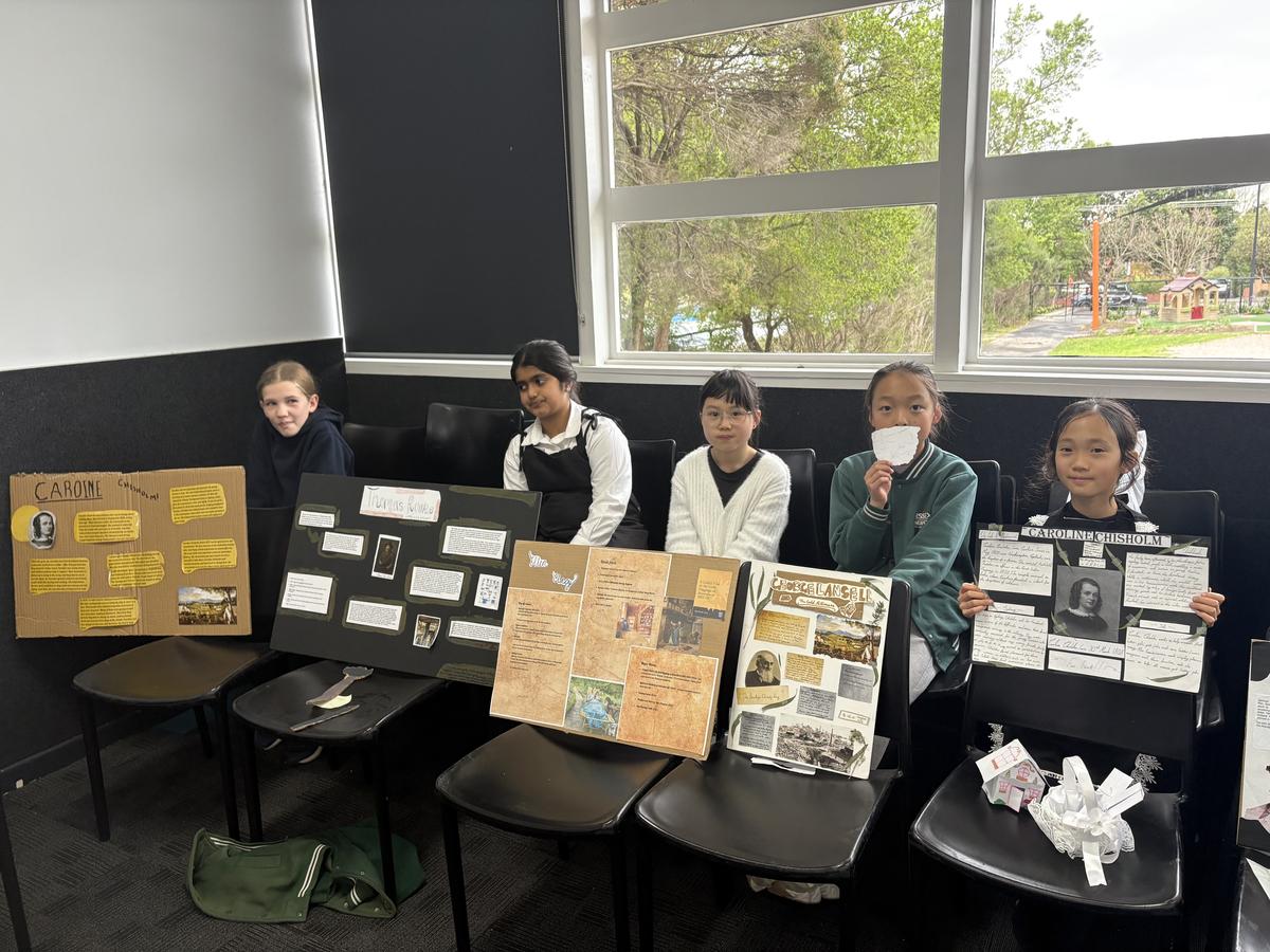 The trip to Sovereign Hill that took place earlier last term, influenced many Year Five students to enhance their posters and costumes. On the day of the Living Wax Museum, the hall was set up as an exhibition space with each student displaying their own posters, artifacts and themselves, dressed as famous people from the Gold Rush. It started off with parents and carers visiting everyone's exhibits and listening to their well-written speeches. Afterwards, various classes started coming in and inspecting our posters and props. After a while, the whole school had visited the Living Wax Museum. The day was fun and great success for all the Grade Five students.
