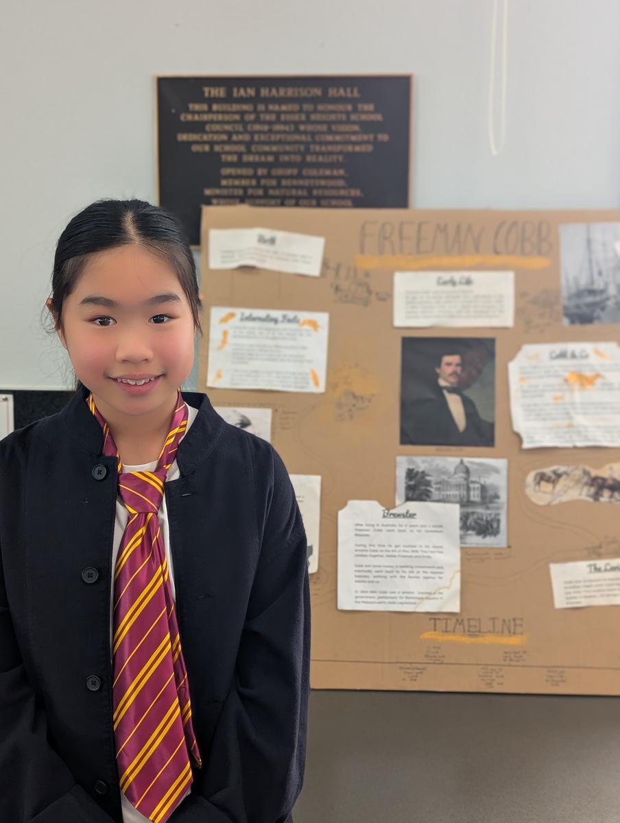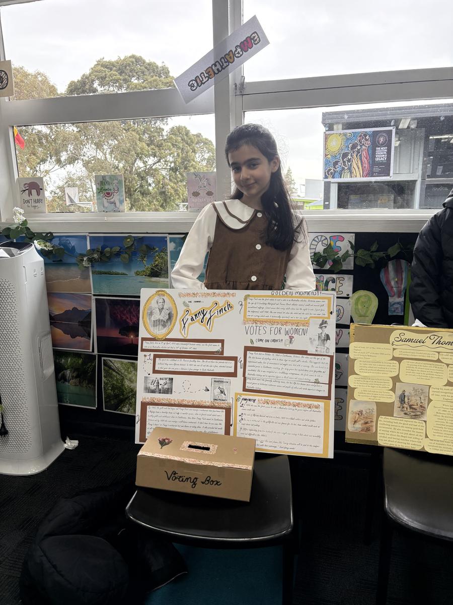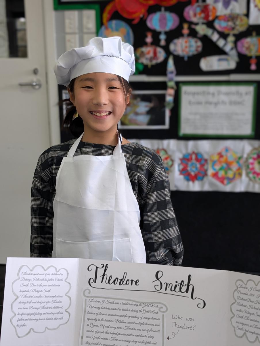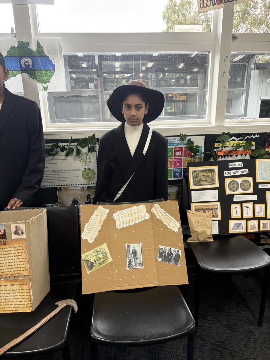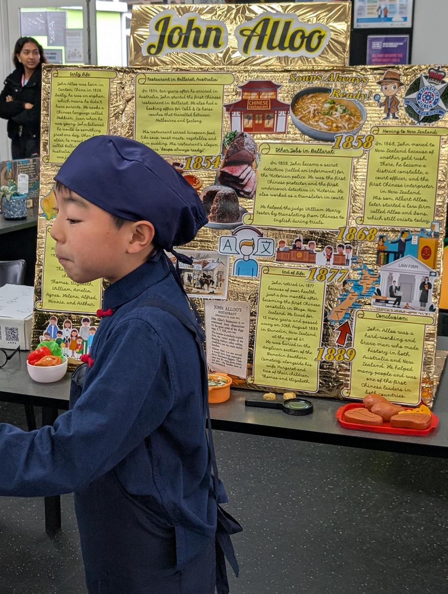 The trip to Sovereign Hill that took place earlier last term, influenced many Year Five students to enhance their posters and costumes. On the day of the Living Wax Museum, the hall was set up as an exhibition space with each student displaying their own posters, artifacts and themselves, dressed as famous people from the Gold Rush. It started off with parents and carers visiting everyone's exhibits and listening to their well-written speeches. Afterwards, various classes started coming in and inspecting our posters and props. After a while, the whole school had visited the Living Wax Museum. The day was fun and great success for all the Grade Five students.
