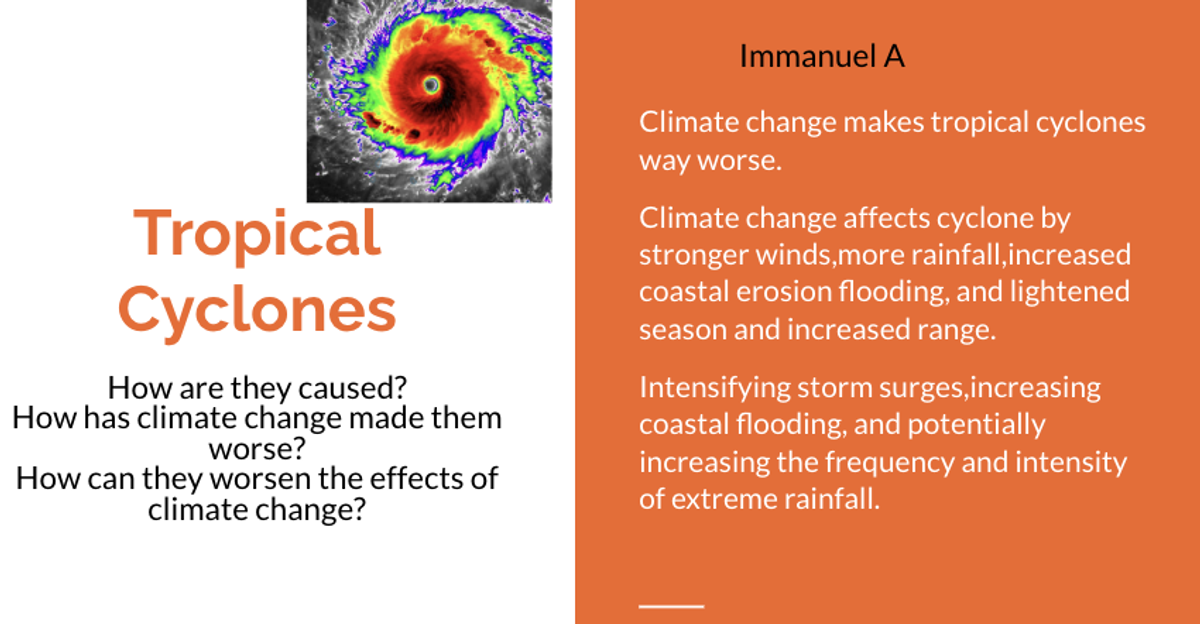 This term in Discovery Based Learning, Religious Education and Writing, the Year 6 students have been exploring the topic of Climate Change and its impact on the severity and frequency of Natural Disasters. Students have conducted research to investigate a range of natural disasters such as floods, wildfires, tornadoes and cyclones and recorded their information on Google Slides. They will apply this newly-gained knowledge to write persuasive texts on why renewable energy sources are imperative to slow down the effect of climate change.